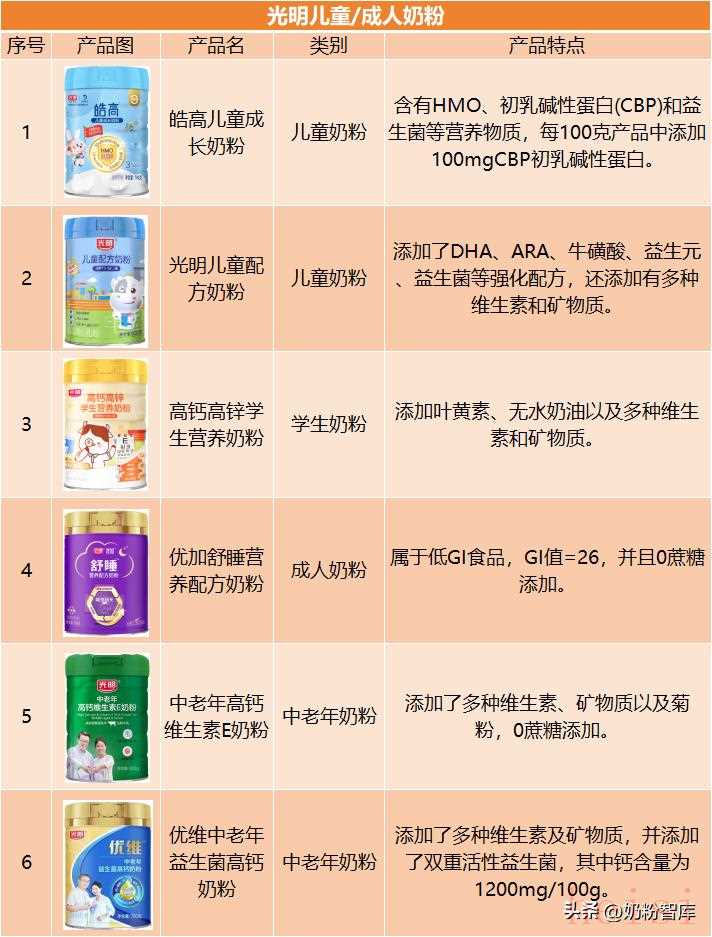 光明在儿童粉、成人粉领域的产品布局逐步完善,儿童奶粉如“皓高”系列添加HMO、CBP等特色成分;中老年奶粉侧重矿物质、益生菌等关键成分的强化,如中老年高钙维生素E奶粉、优维中老年益生菌高钙奶粉等。