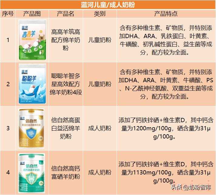 蓝河专注绵羊奶领域,构建差异化产品体系。“高高羊”、“聪聪羊”等儿童奶粉配方全面,注重益智与自护,添加DHA、叶黄素、益生菌等营养成分;成人粉系列包括“倍自然”系列的高蛋白、高钙富硒等不同侧重点的奶粉。