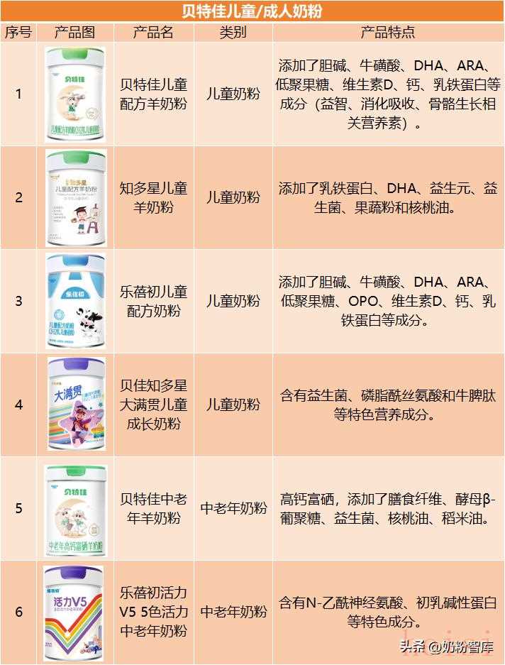 贝特佳在儿童粉、成人粉领域的产品布局也较广。儿童奶粉关注益智、消化与骨骼健康,如“知多星大满”含有益生菌、磷脂酰丝氨酸和牛脾肽等特色营养成分;中老年奶粉则强化富硒、膳食纤维、益生菌等成分,如贝特佳中老年羊奶粉。