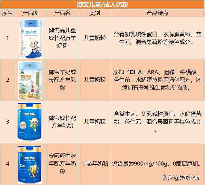 御宝专注羊奶产业,产品同样覆盖各年龄段。其儿童奶粉关注成长营养搭配,如御宝羊奶成长配方羊乳粉强化了DHA、水解蛋黄粉、益生菌等成分;中老年奶粉如“安颐舒”系列侧重基础营养,主打0蔗糖高钙配方。