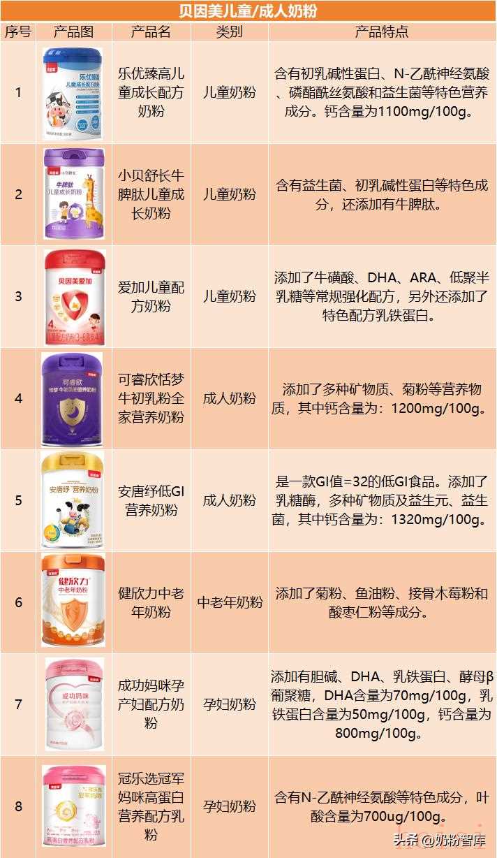 贝因美在儿童粉、成人粉领域的产品布局精耕多年,儿童粉如“乐优臻高”系列聚焦骨骼生长与免疫支持,含初乳碱性蛋白、牛脾肽等特色成分;成人粉包括“安唐纾”低GI配方和添加了菊粉、鱼油粉、接骨木莓粉和酸枣仁粉等特色成分的“健欣力”,另外也有“成功妈咪“、“冠军妈咪”等孕妇奶粉,满足家庭多元营养需求。