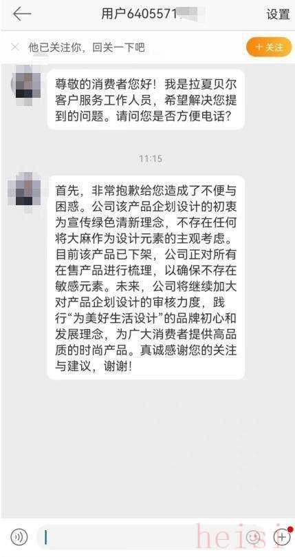 记者注意到,在该网友晒出的一张聊天对话截图里,一位自称是拉夏贝尔客户服务工作人员的博主曾表示,“公司该产品设计的初衷为宣传绿色清新理念,不存在任何将大麻作为设计元素的主观考虑。目前该产品已下架,公司正对所有在售产品进行梳理,以确保不存在敏感元素。未来,公司将继续加大对产品企划设计的审核力度,践行‘为美好生活设计’的品牌初心和发展理念。”但记者通过该用户微博名进行检索时却并未找到该用户。