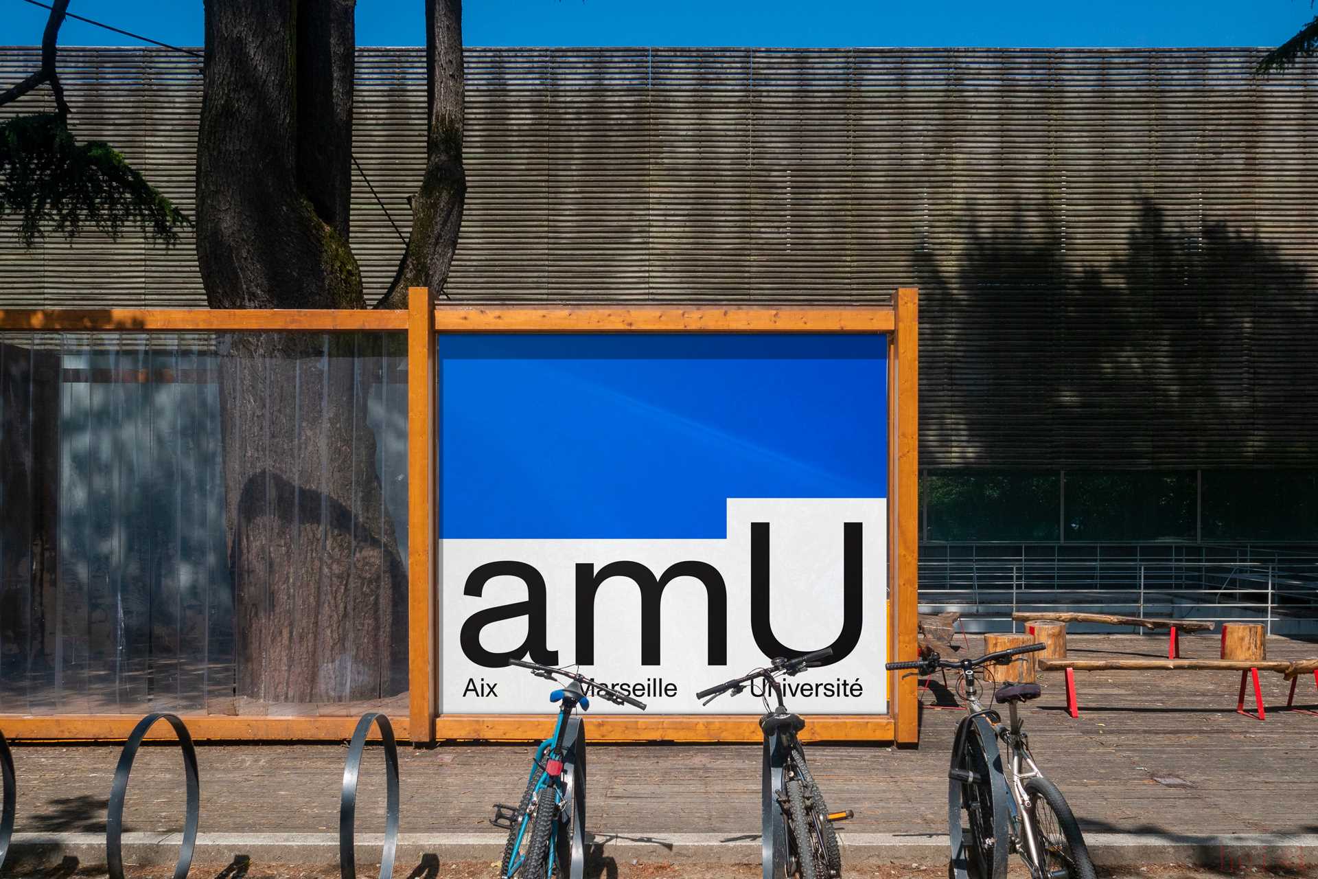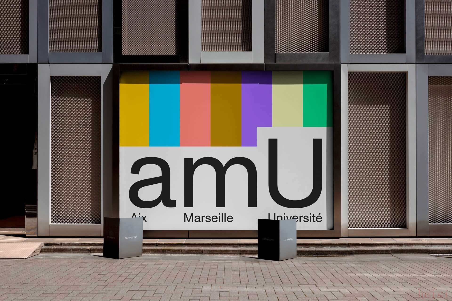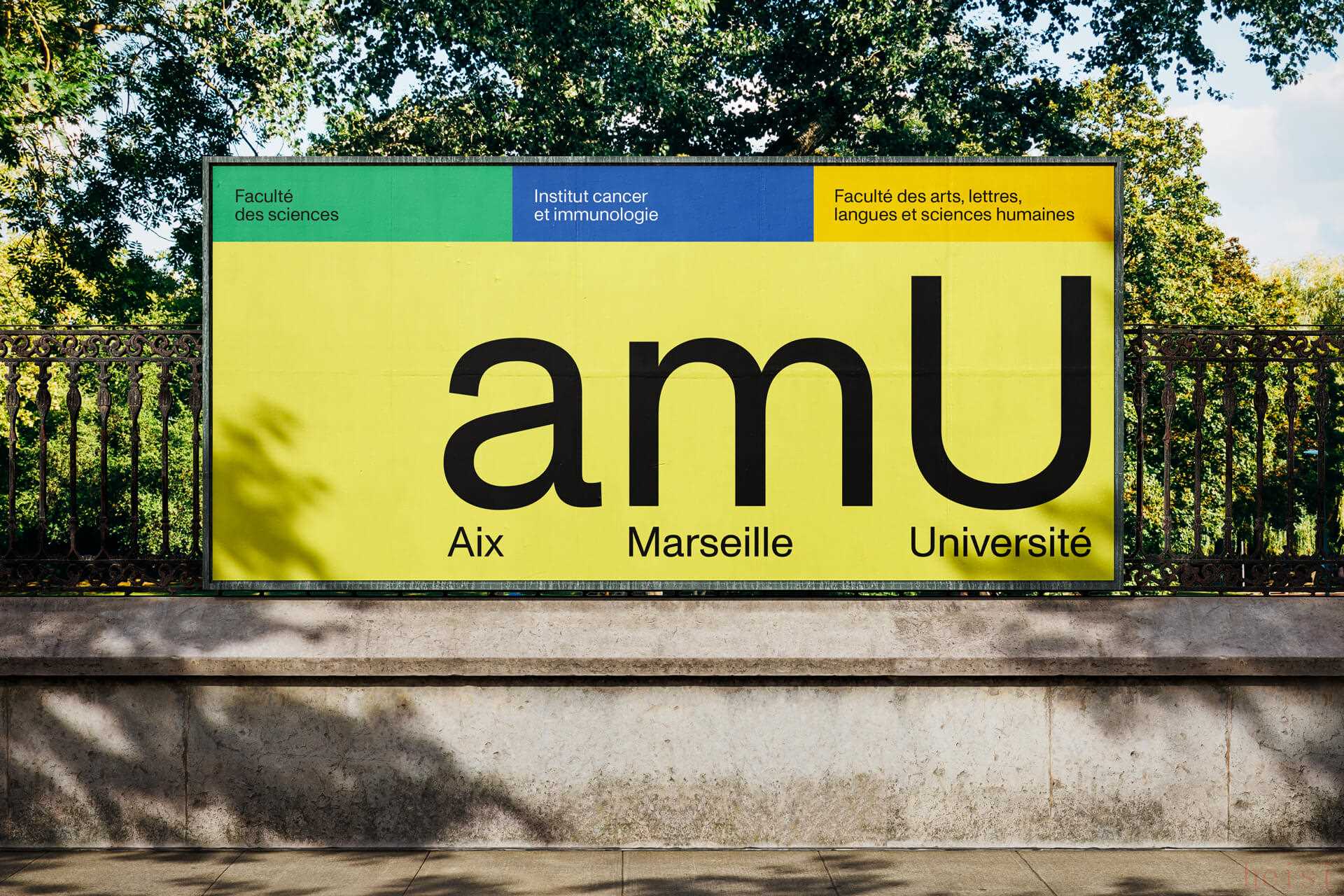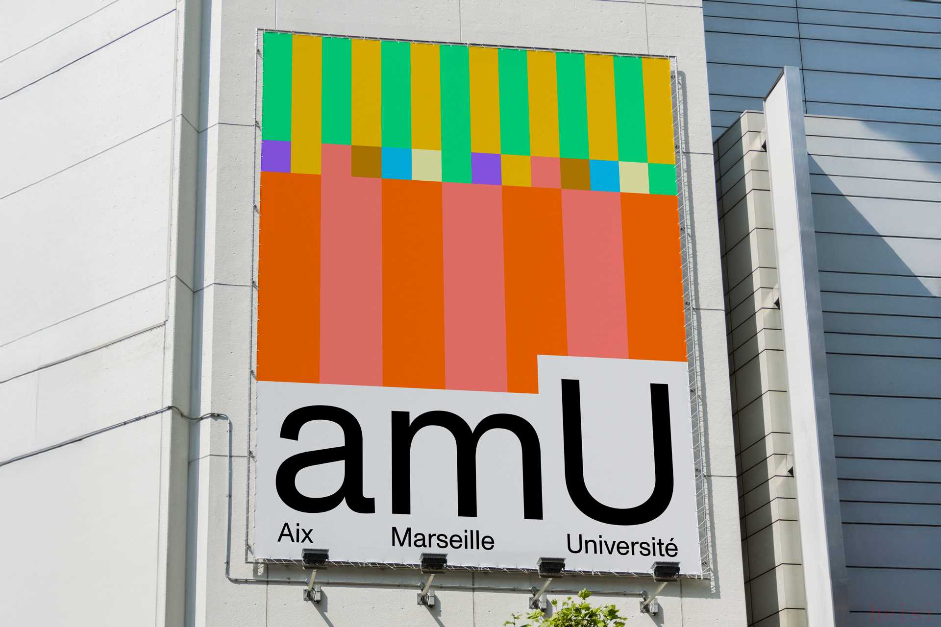 3. "设计时间:" 这个新的品牌标识于 "2023年" 正式推出,旨在重塑大学形象,以适应其发展的新阶段(AMU 是由原有的 Aix-Marseille Université 合并而来)。