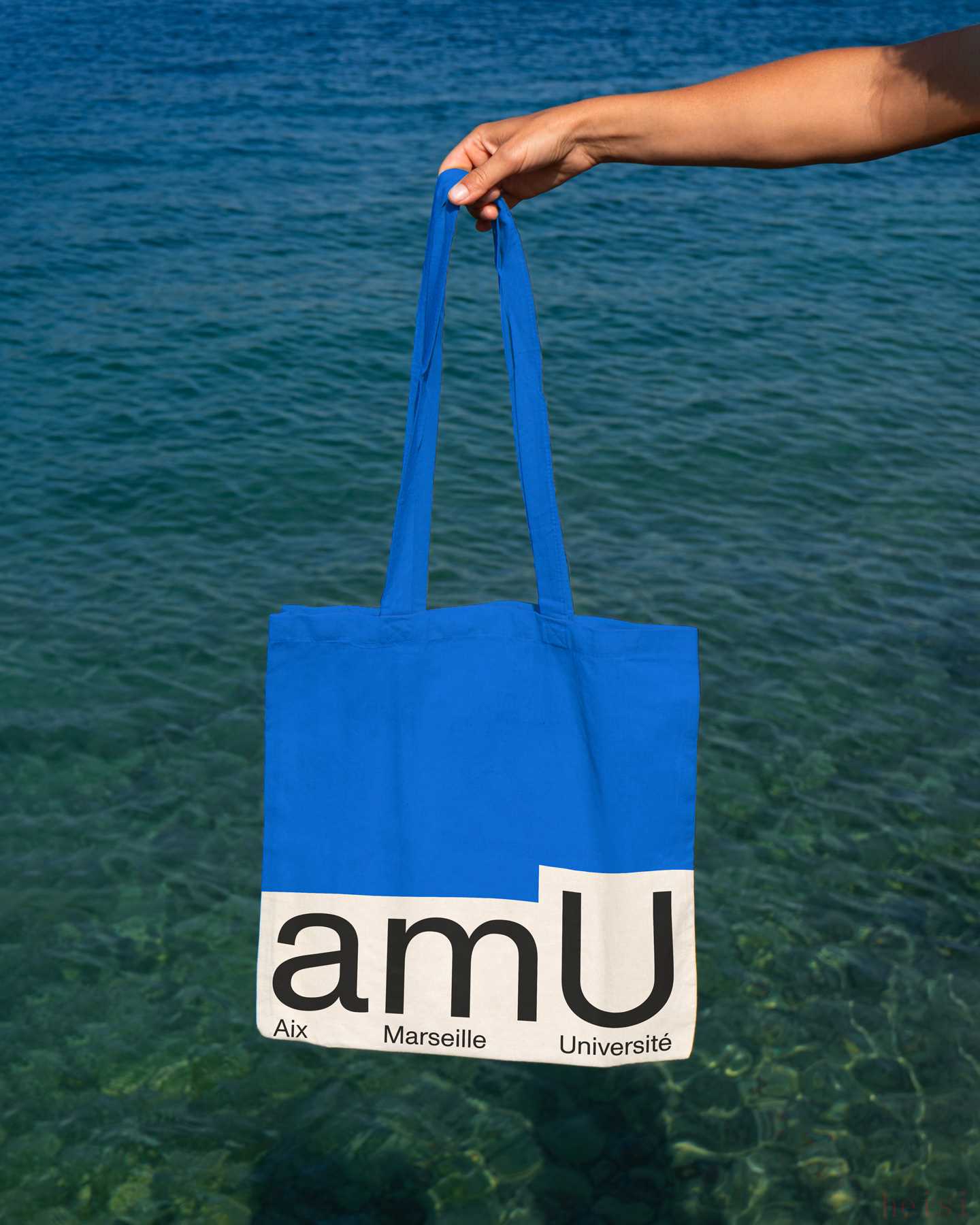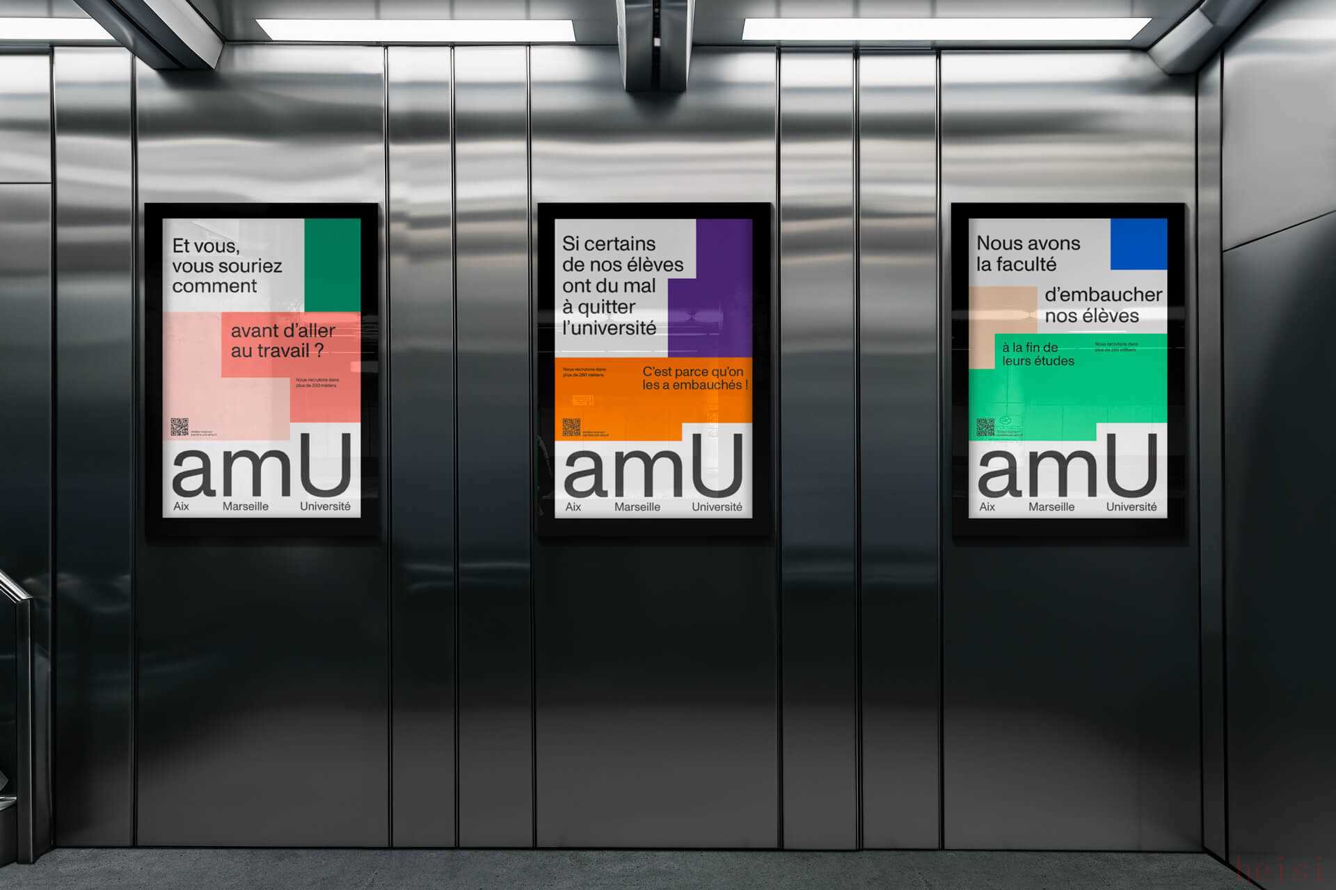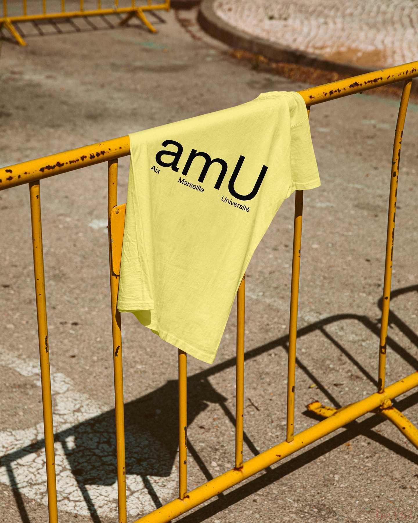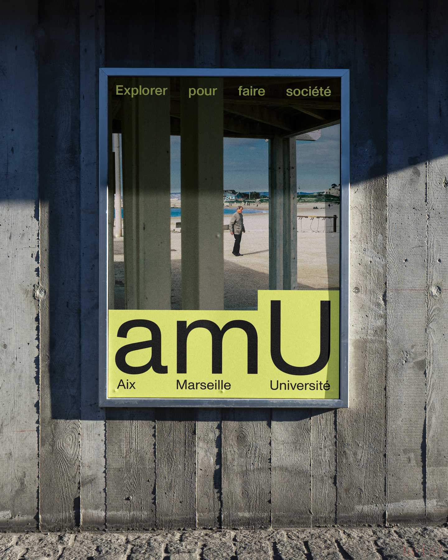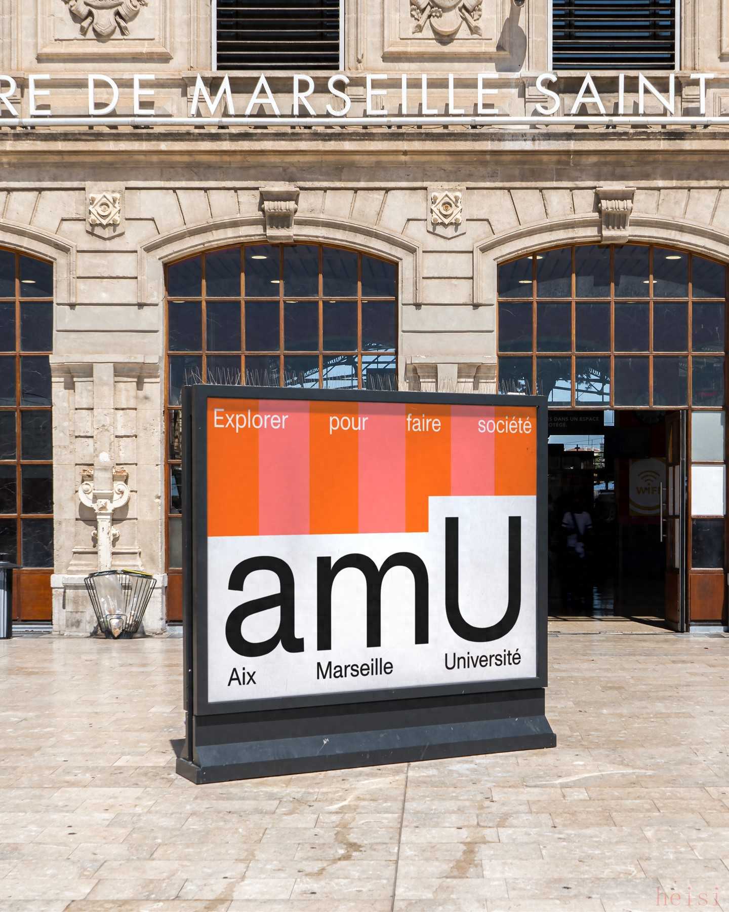3. "设计时间:" 这个新的品牌标识于 "2023年" 正式推出,旨在重塑大学形象,以适应其发展的新阶段(AMU 是由原有的 Aix-Marseille Université 合并而来)。