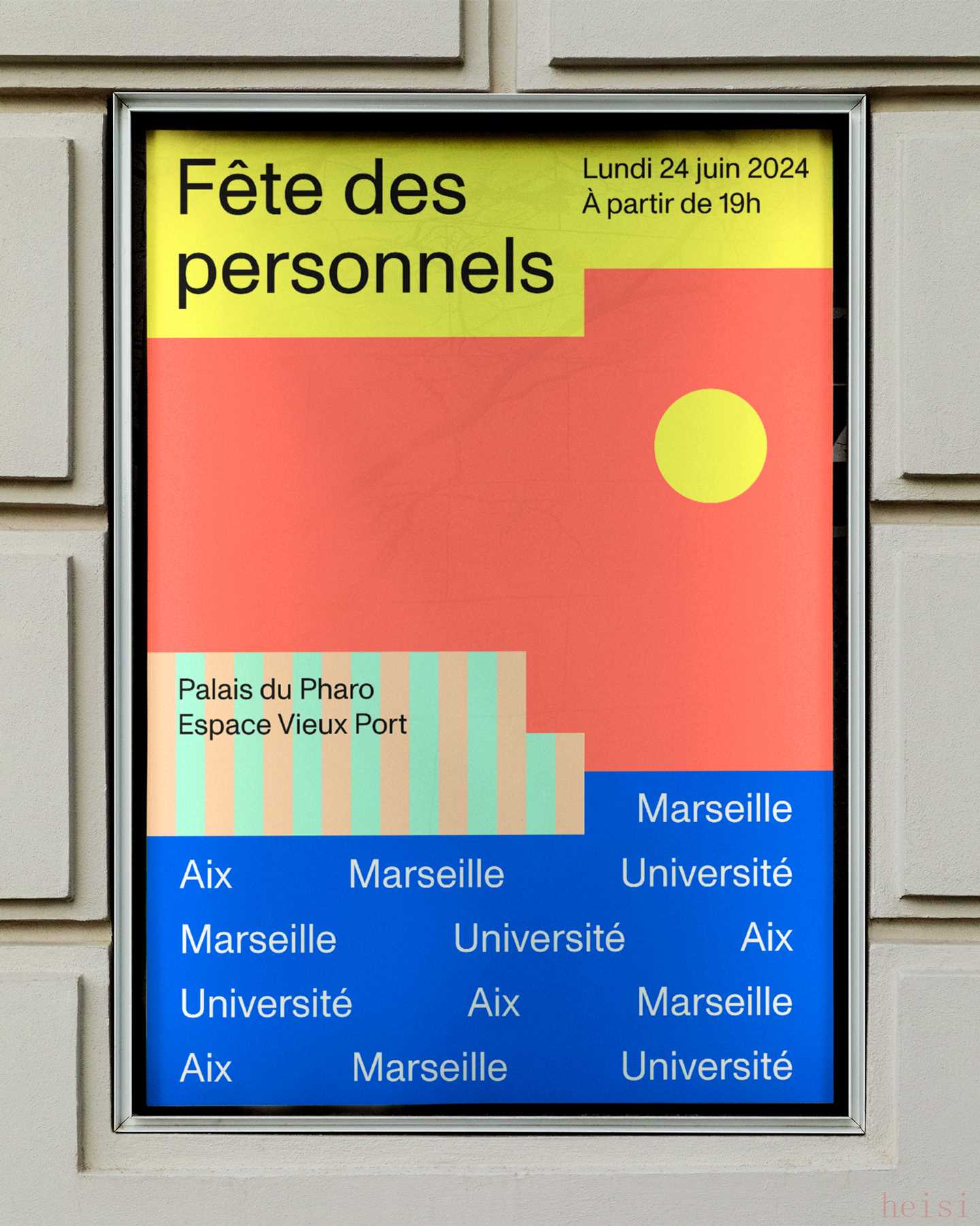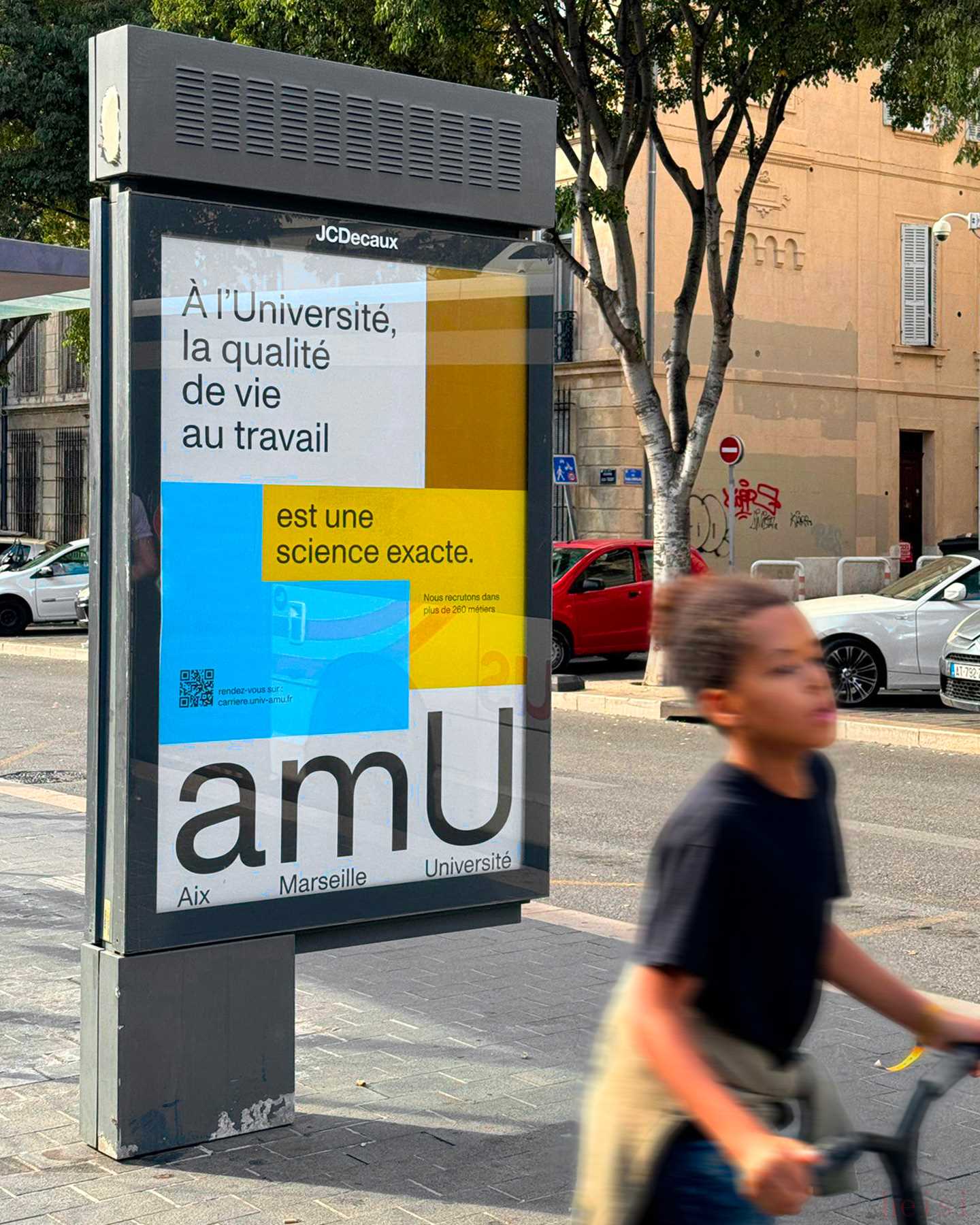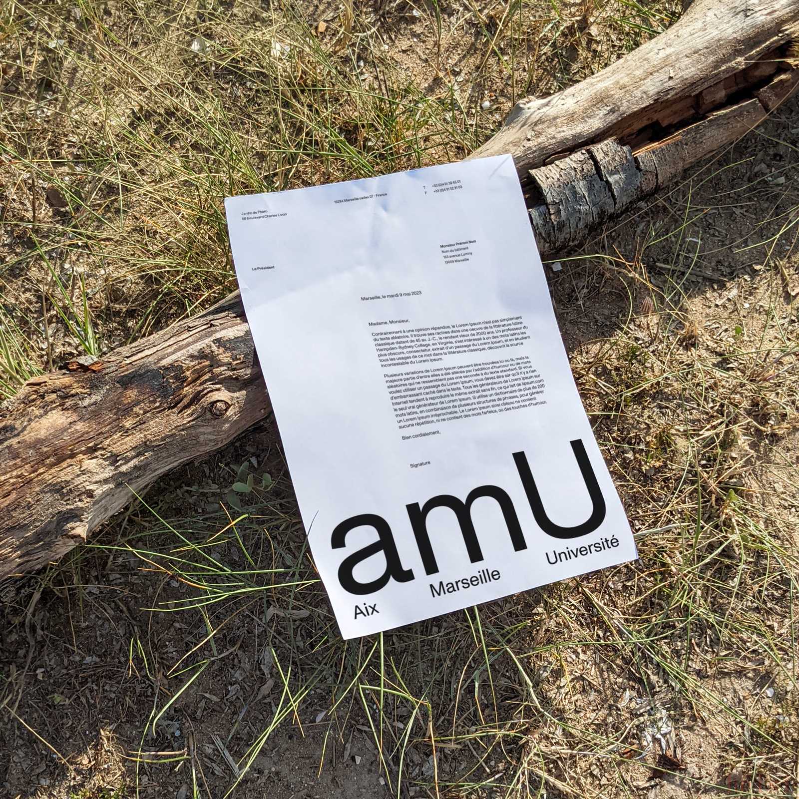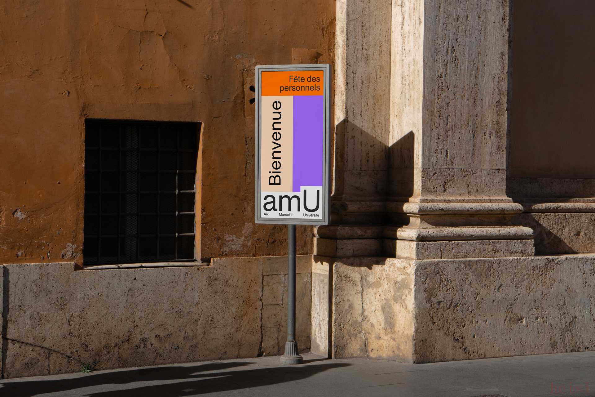 3. "设计时间:" 这个新的品牌标识于 "2023年" 正式推出,旨在重塑大学形象,以适应其发展的新阶段(AMU 是由原有的 Aix-Marseille Université 合并而来)。