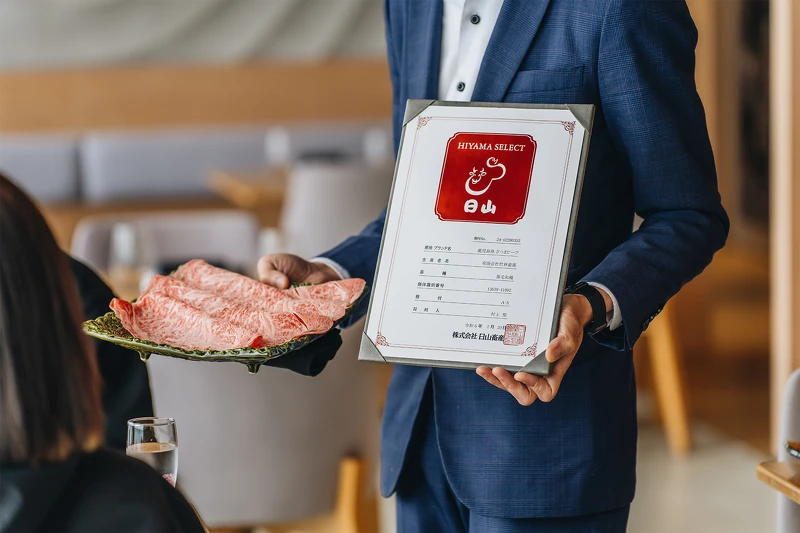 肉品在来到前,还需经过和牛鉴定师,评估每个部位的赤身和脂肪比例、旨味释放方式、脂肪融化的油香与品质,每款肉品的资料皆能在《日山笔记》中查询。日山凭藉着无人能出其右的百年实力,荣获 SQF 食品安全品质认证中最高等级,展现对肉品食材的最高敬意。今已传承到第四代,社长村上宗郎不仅进行收购牧场计画,以自家调配饲料育肥契作牛只,更着手与学者共同钻研,探究美味牛肉的完美脂肪比例。
