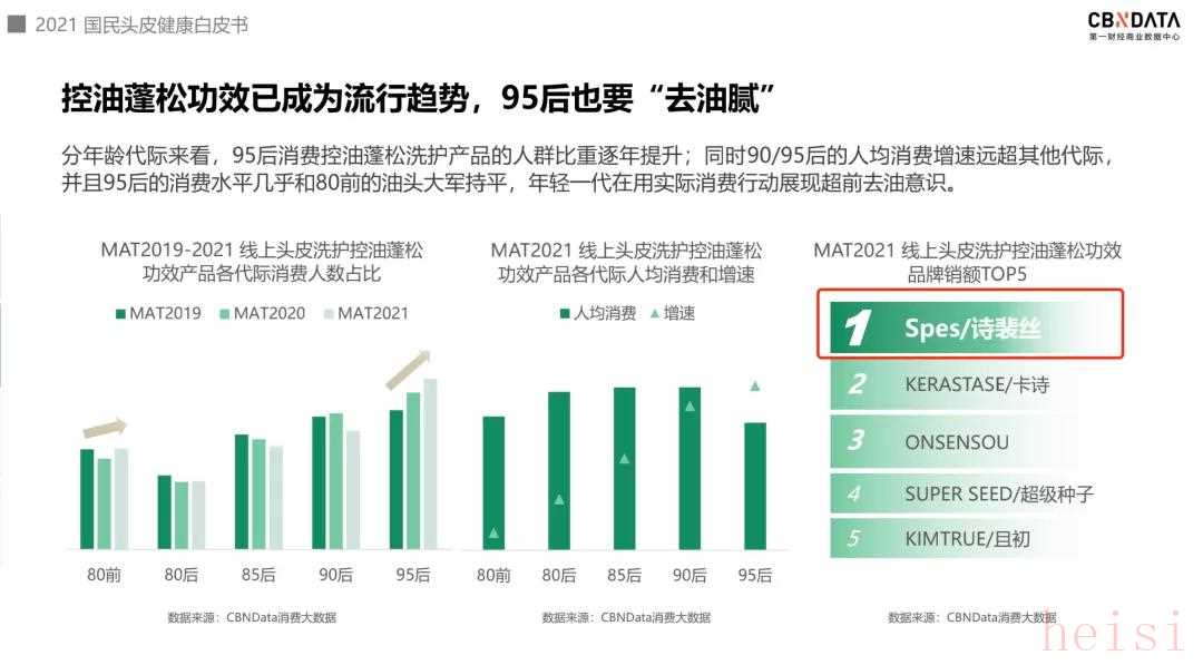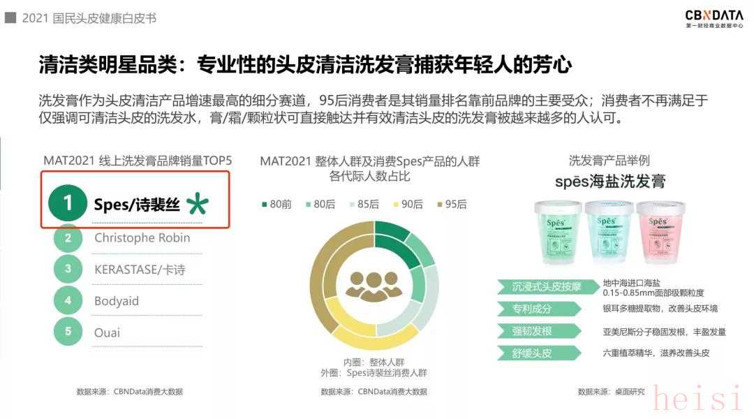 2020年4月,Spes进驻天猫,很快就有产品登顶天猫细分品类销量第一,成为2020年增长最快的新锐个护品牌之一,并入选“天猫宝藏新品牌”。第一财经商业数据中心(CBNData)最新发布的《2021国民头皮健康白皮书》(下简称《报告》)显示,Spes在线上洗发膏品牌中销量TOP1,跻身线上头皮洗护品牌消费TOP10;在今年线上头皮洗护控油蓬松功效品牌销售额排名中,Spes位列第一,成为“控油蓬松第一品牌”。