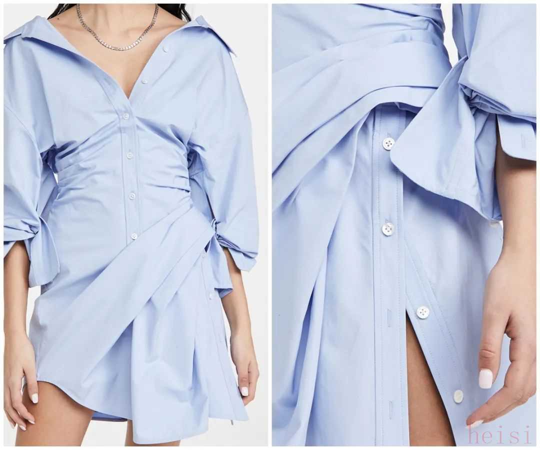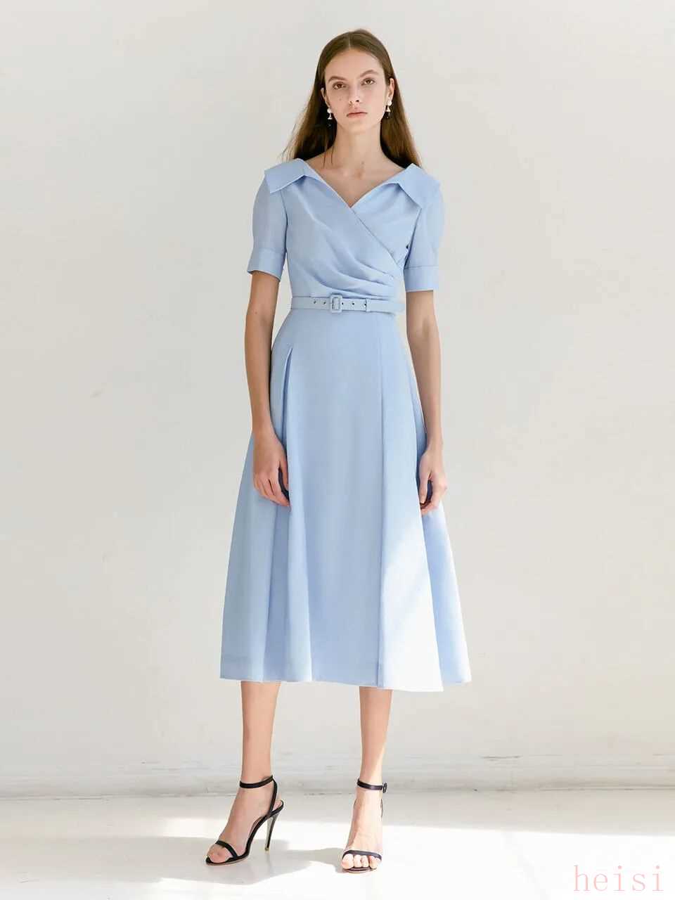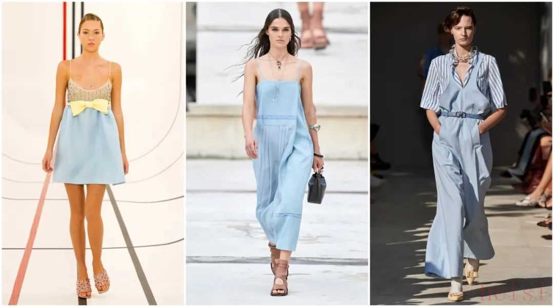 浅蔚蓝色的裙子非常有轻盈感。不过不同面料呈现出来的感觉不同。▼