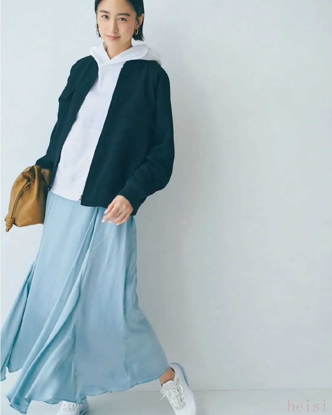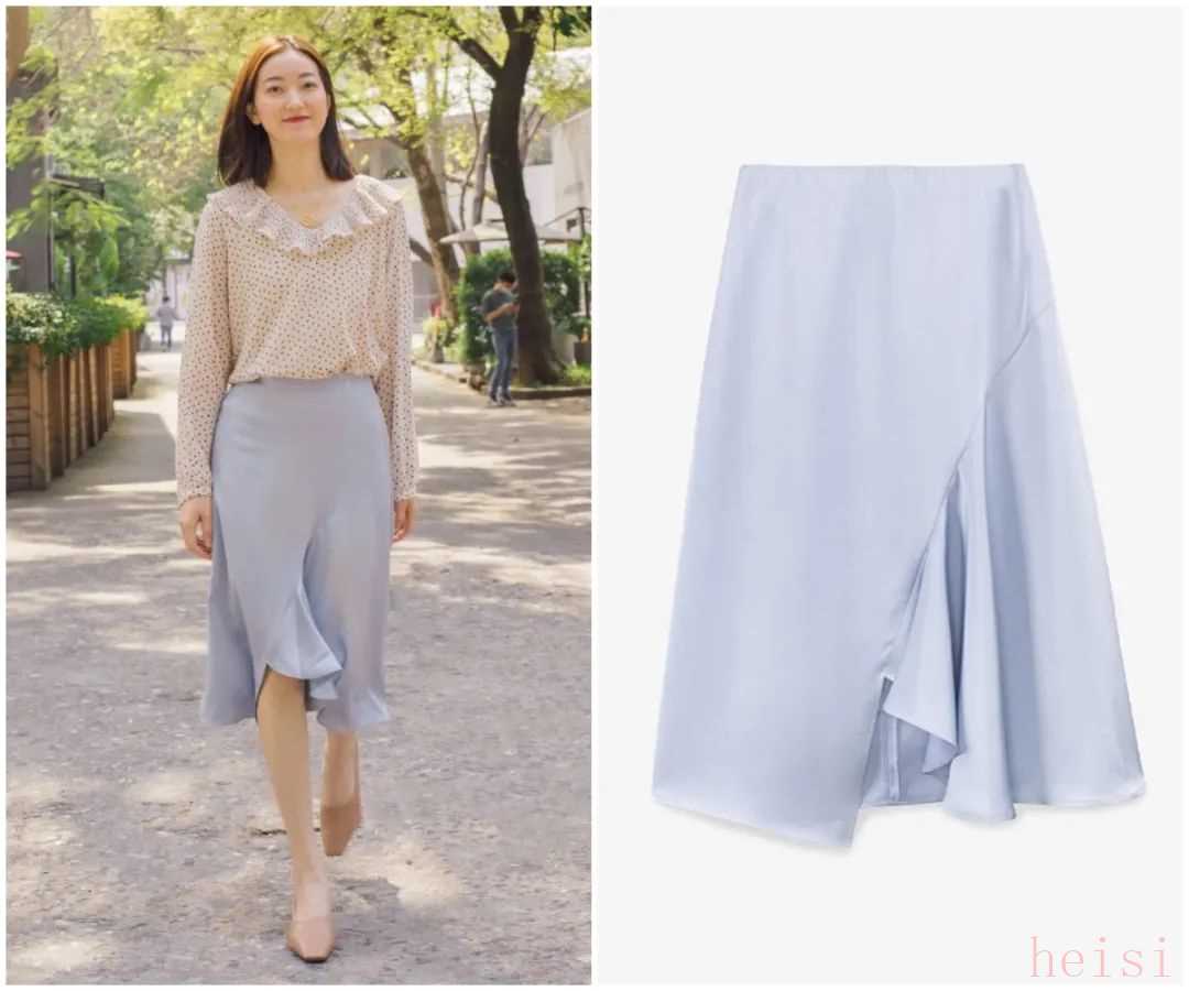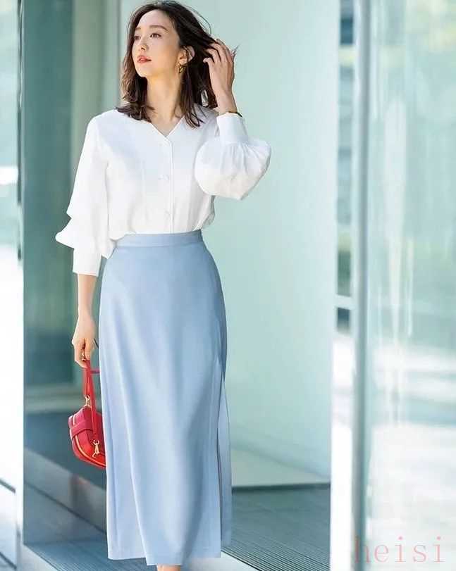 浅蔚蓝色的丝质半裙也挺值得推荐的,上衣搭白色就好。记得选迷笛裙长度的,款式选宽松一点的,更大方。▼
