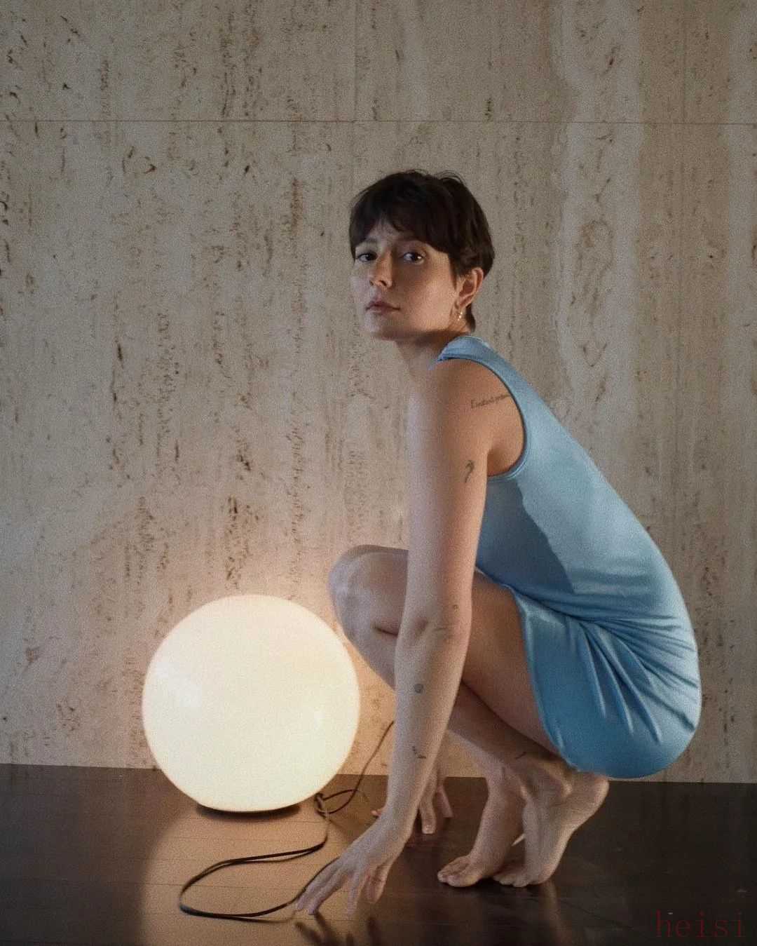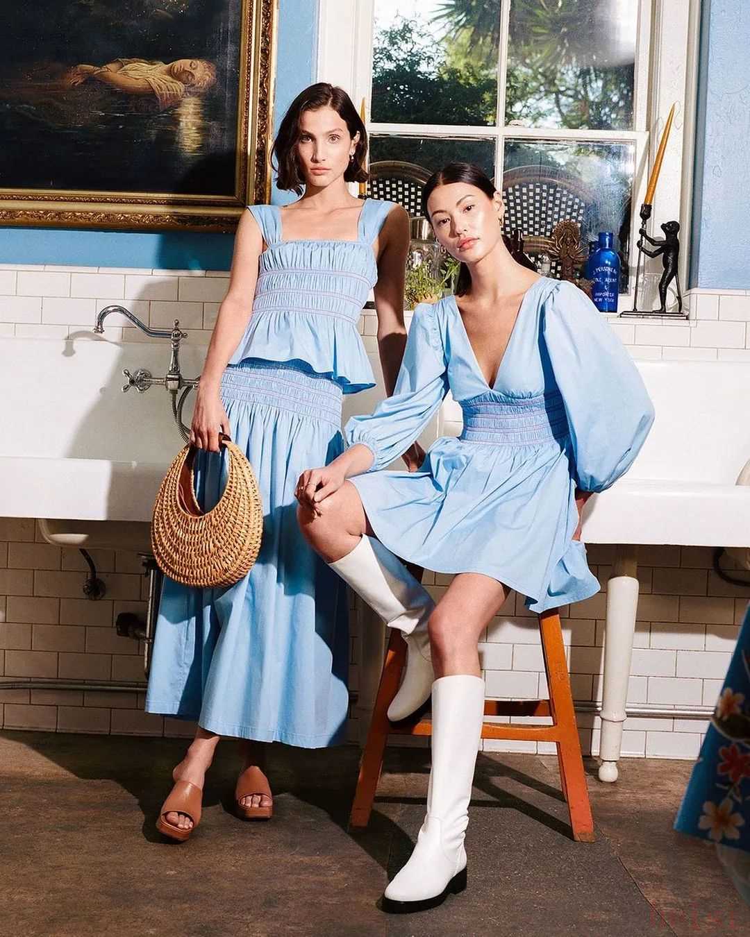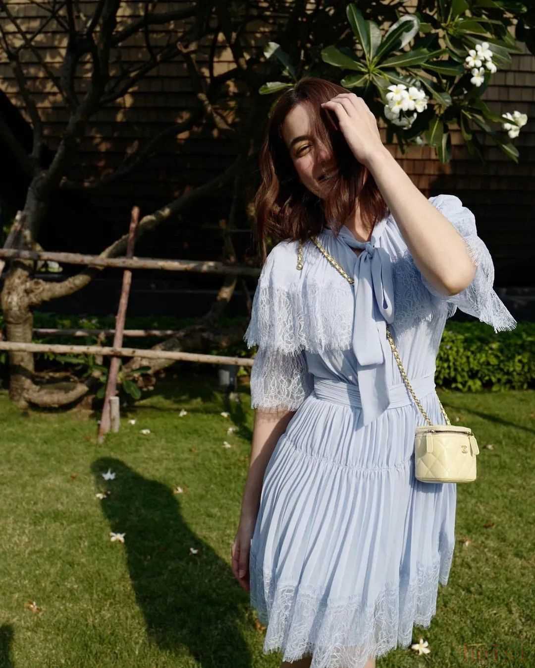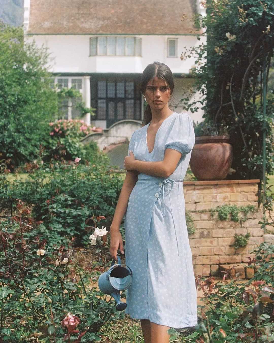 浅蔚蓝色的棉质裙子,再加上一些褶皱设计,会比较有度假风。出去玩的时候可以这么穿~▼