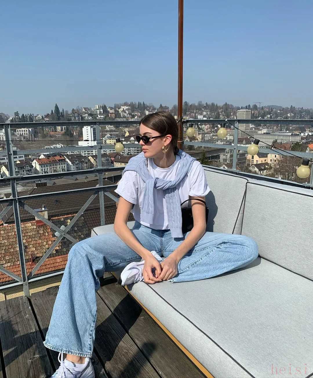 一般时装精都会穿白色内搭,白T、白衬衫都行。周末出去玩,内搭可以换成一条连衣裙。▼