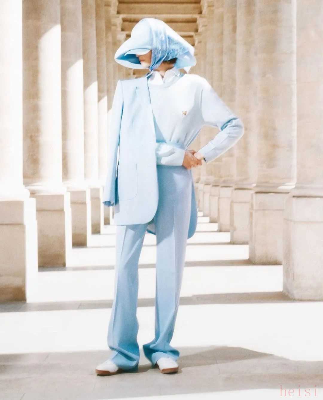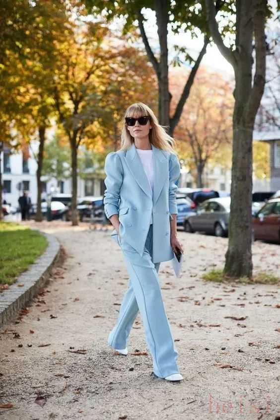 浅蔚蓝色西装特别适合穿去上班,显得人很精神。搭配白裤子,是蓝天白云的配色,超清爽。▼