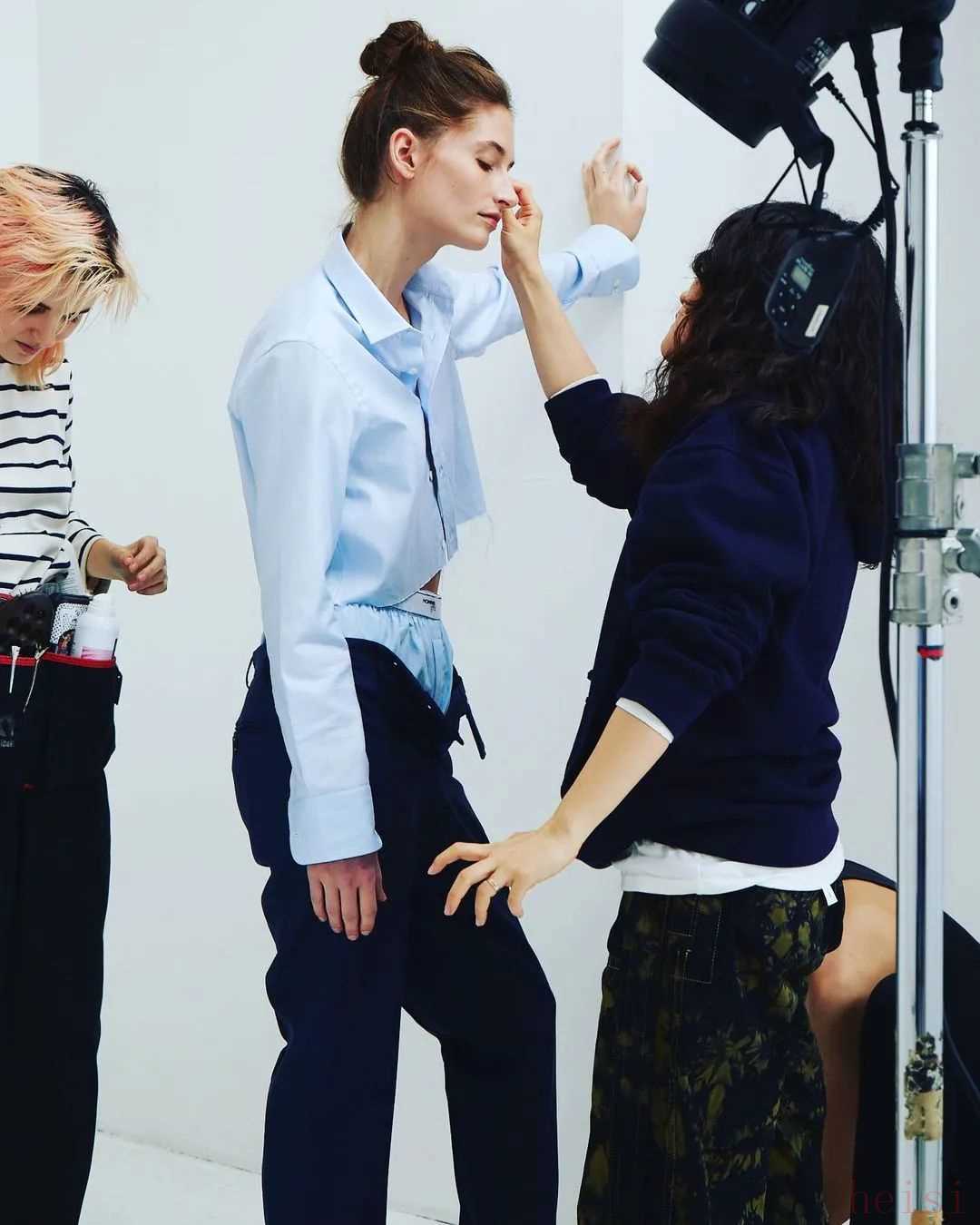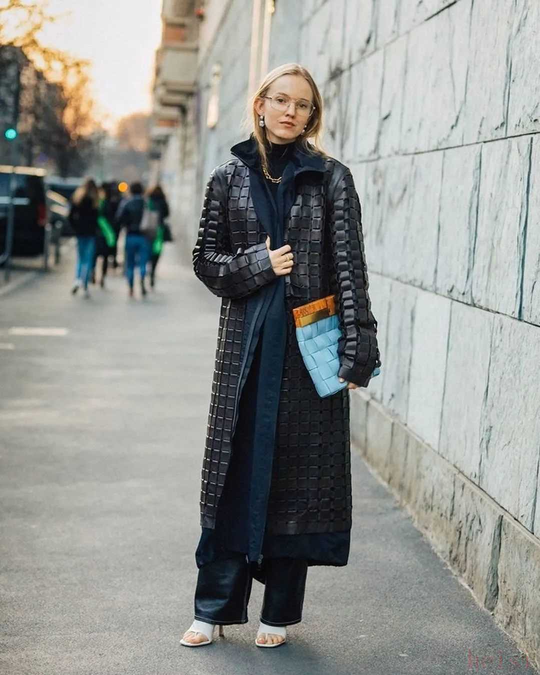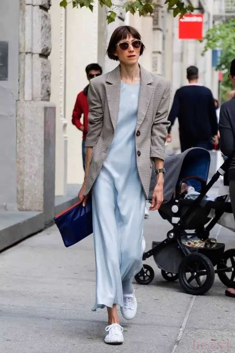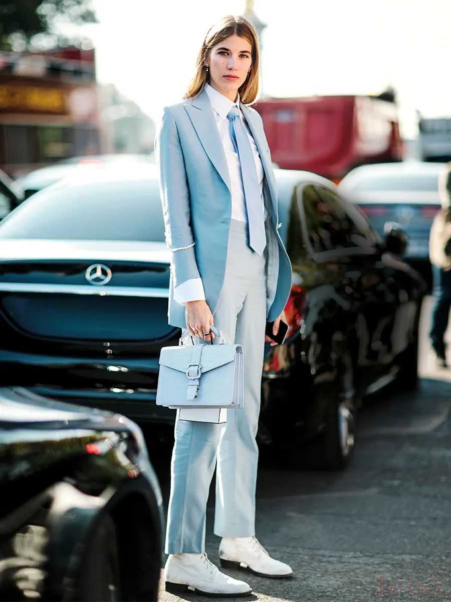 对了,穿浅蔚蓝色衣服时还很适合加配饰丰富造型。但也不要选颜色太跳脱的,浅金色、白色或者蓝色都可以。时尚编辑兼博主Veronika Heilbrunner加了一条领带,有点Boylish风。▼