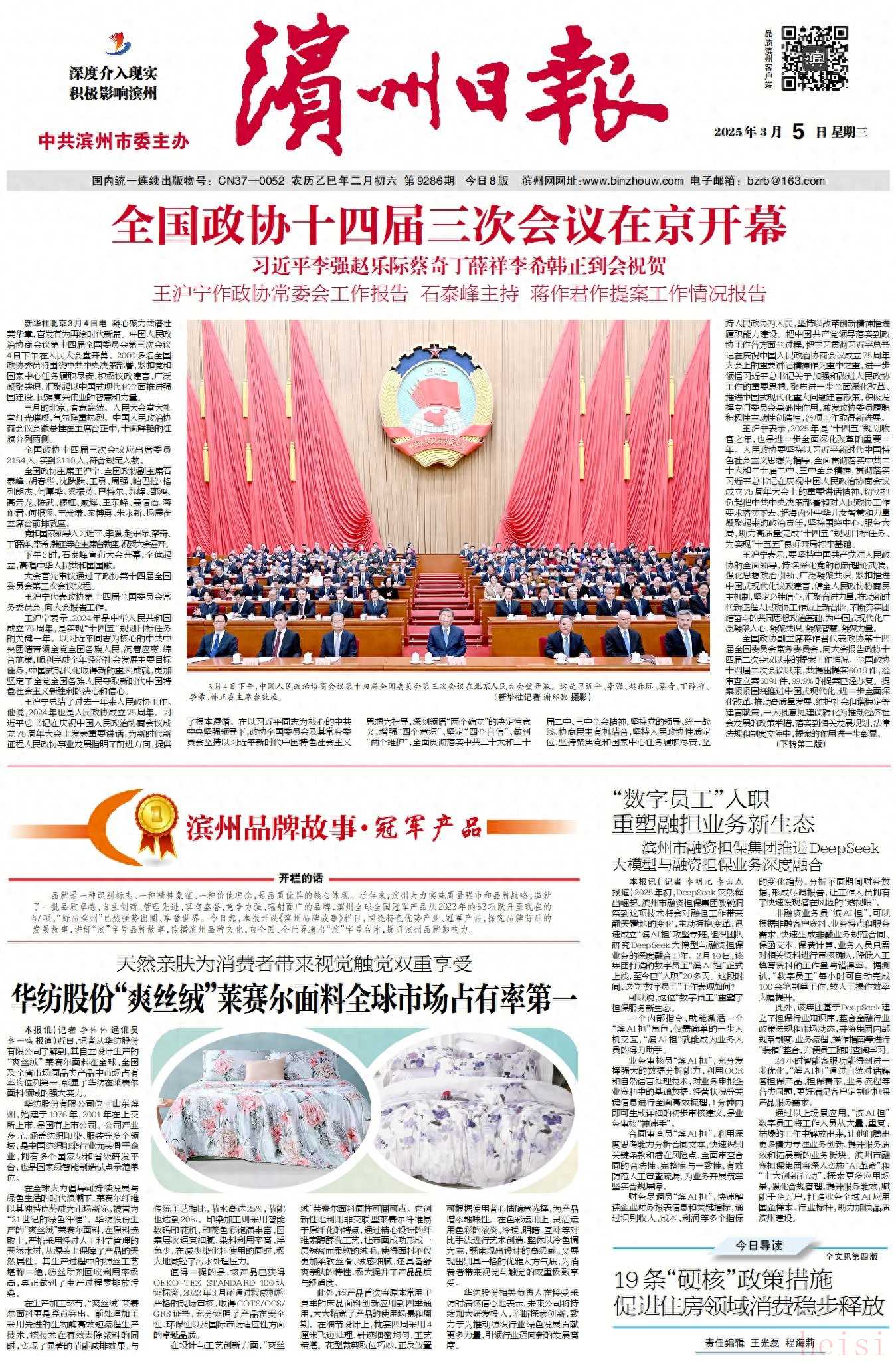 滨州日报/滨州网讯近日,记者从华纺股份有限公司了解到,其自主设计生产的“爽丝绒”莱赛尔面料在全球、全国及全省市场同品类产品中市场占有率均位列第一,彰显了华纺在莱赛尔面料领域的强大实力。