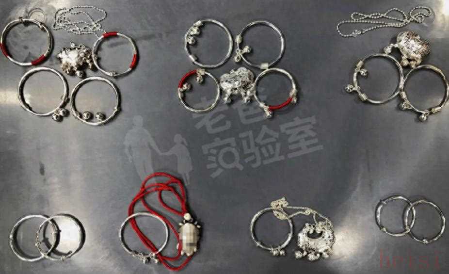 除了银耳钉,其他银饰也存在类似情况。据博主之前测评显示,他从网上和线下分别买了几款宝宝佩戴的银饰送去检测,7款产品中有4款是假银饰,假货率高达57.14%!