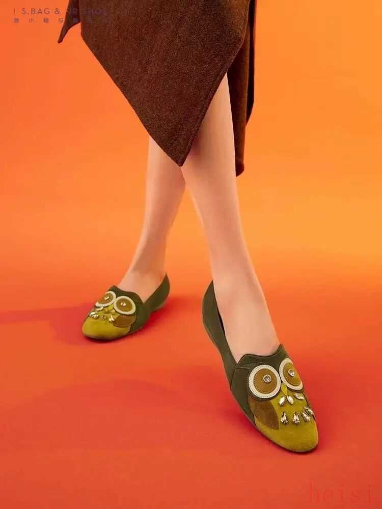 橄榄绿色拼接黄绿色羊猄,猫头鹰异形鞋口生动有趣,散落得彩钻点缀增加价值感。