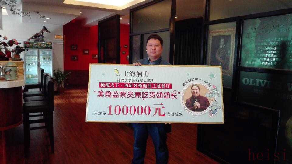 橄榄天下还聘请旅行家大鹏为橄榄天下生活馆-西班牙橄榄油主题餐厅的“特约美食监察员兼吃货团团长”,并送给大鹏10万元的福利。大鹏对餐厅菜品赞不绝口,评价说:“每一次的品尝都有新的感受,健康用油,健康烹饪,非常值得推广,也会把福利全部送给爱吃、会吃的朋友们。”