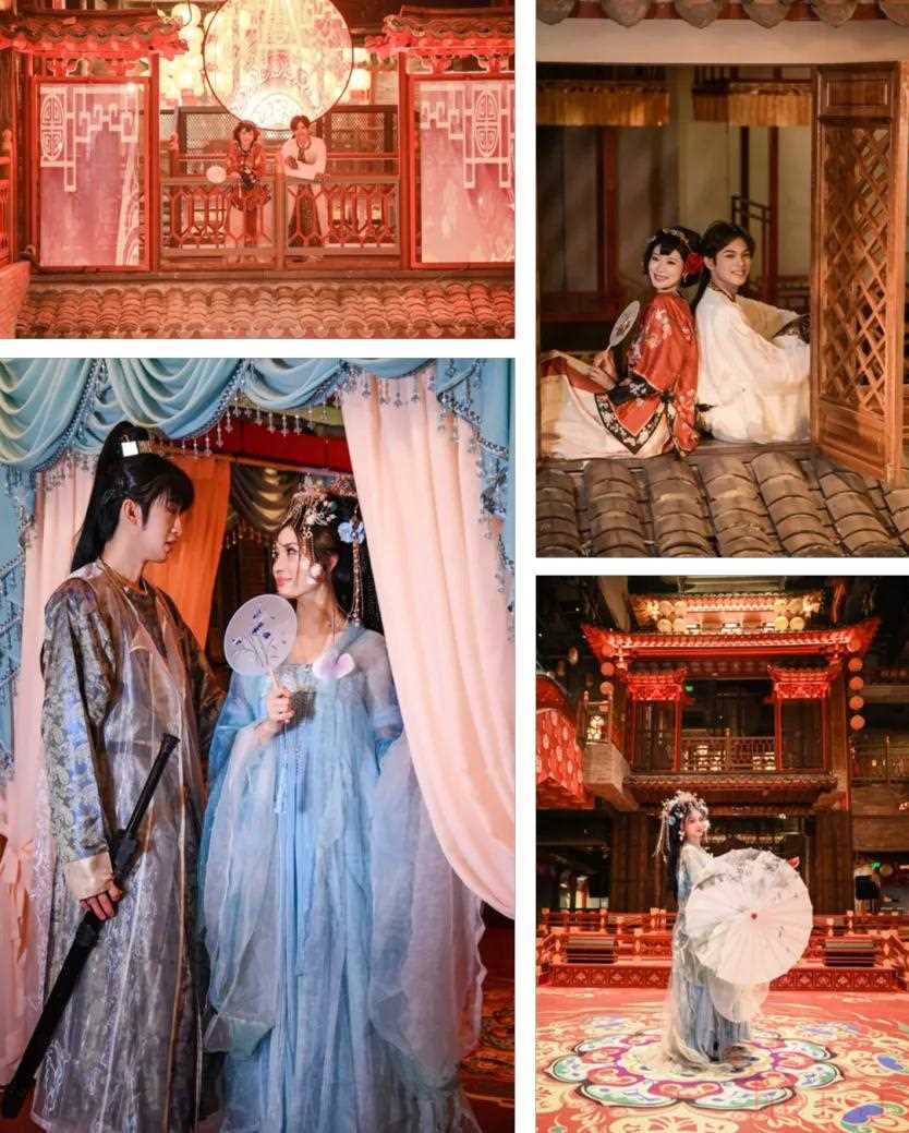 穿上汉服打卡国潮城网红拍摄点,在这里,中国古建筑元素,宫殿、官署、民居等传统风格交相辉映。从楼体框架到灯笼装饰,国潮城极尽所能处理景致细节,呈现一步一景、所见即所得的观感体验。