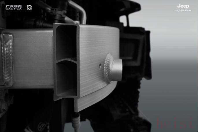 水箱支架是车辆前部的一个重要部件,与车身纵梁相连接,大灯、水箱、冷凝器等部件均安装在水箱支架上。由于水箱支架周围温度较高,如持续颠簸行驶,容易造成形变或开裂。Jeep在设计之初便考虑到SUV将在连续颠簸路况下行驶。在制造时采用钢塑混用材质,能将高温颠簸时的形变开裂风险降到最低。经FCA高温振动耐久测试,Jeep现役的水箱支架即使在-40°C~104°C的环境舱内持续振动20-30天,依旧不会变形,保证安全使用。