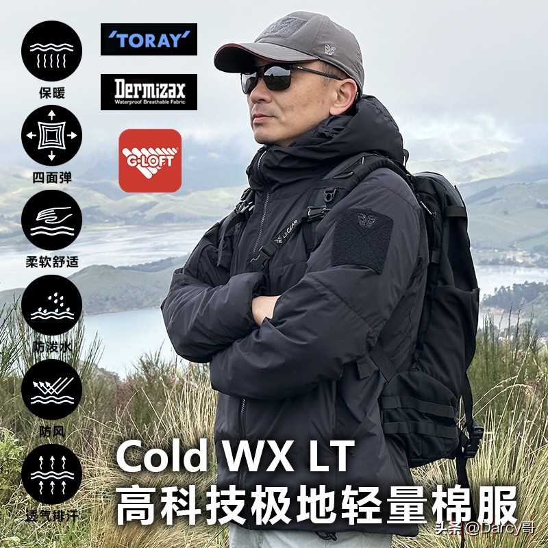 这款三代B6级重型龙牙泰坦防寒服加强版,以泰坦命名一款装备,可以抵御-15°C酷寒天气。采用Cordura弹力覆膜面料,结实耐磨,泰坦的填充物采用Cross Core技术的PrimaLoft Gold Insulation金标P棉保暖材料--气凝胶P棉。气凝胶作为先进的保温材料,可应用于航天领域,气凝胶P棉保暖效果优越,具有轻量、柔软、拒水的特性。PrimaLoft Gold (金标系列)保暖材料与气凝胶技术相结合,具有很高的保暖性,(其中大身填充200g/m²气凝胶P棉、袖子填充170g/m²气凝胶P棉),P棉本身拒水、轻量、柔软,穿着舒适。外层面料添加 75D CORDURA耐磨纤维,通过10000次耐磨测试,从通勤到户外,轻松hold住。3、鬼谷战术户外COLD WX LT保暖棉衣棉服抗寒G-loft棉防水透气高科技