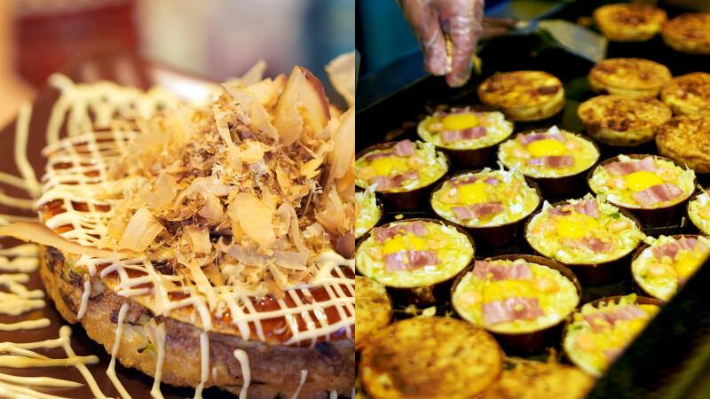 由日本老闆于2007年创立的,是饶河夜市里独一无二的日式小吃,不用飞出国就能吃到最道地美味。圆形模具中倒入麵糊与满满高丽菜丝,再加入虾仁、花枝、培根与起司球,最后打上一颗蛋煎至金黄。起锅前刷上酱汁、淋上美乃滋再洒满柴鱼片,外层焦香酥脆内馅饱满,每一口都能吃到丰富食材与蔬菜的鲜甜。