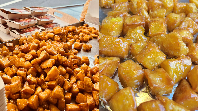夜市尾段的人气甜点,好吃到甚至和便利商店、全联等销售通路合作。57号地瓜高温炸至金黄,再快速裹上熬好的麦芽糖浆,外层是薄脆的糖衣、内里则是绵密的地瓜心,外酥内软不黏牙也不黏手,甜而不腻。小明共有拔丝地瓜、冰拔丝地瓜、冰烤地瓜、地瓜片饼乾、地瓜一口酥等品项,值得一併带回家。