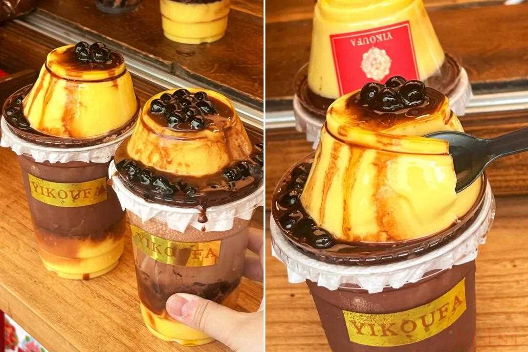 在这款产品里,布丁不只是饮品中的配料,而是作为一款单独的甜点完整地放置在饮品上方(布丁倒扣在杯盖里,放置在奶茶杯上),再淋上糖浆或黑糖珍珠。