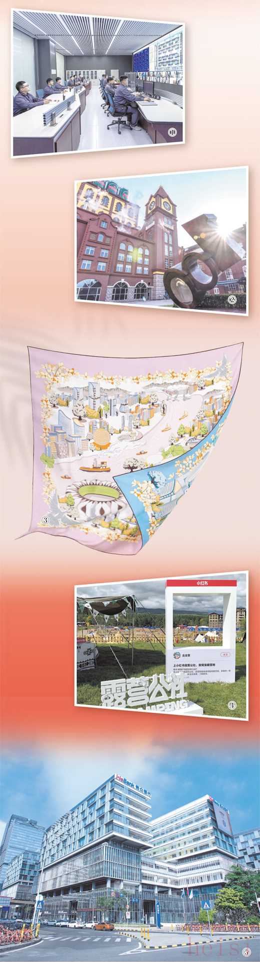 图①:润泽科技数据中心的监控大厅。 图②:青岛啤酒厂一角。 图③:万事利的一款双面印花大方巾示意图。 图④:小红书举办的露营活动现场。 图⑤:微众银行办公楼外观。 本版图片均为资料图片