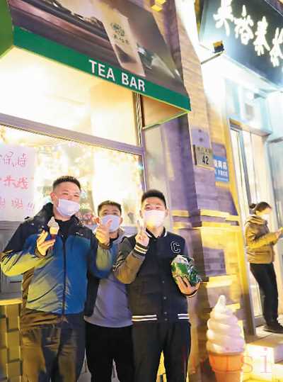 顾客在位于前门大街的老字号吴裕泰门店前合影。 本报记者 龚文静摄