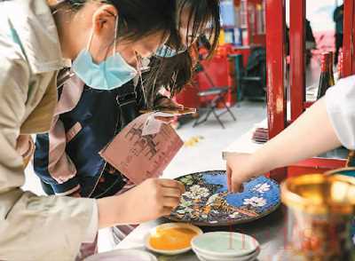 在北京前门大街举行的“前门国潮京品节”上,游客体验景泰蓝的点蓝技艺。 新华社记者 彭子洋摄