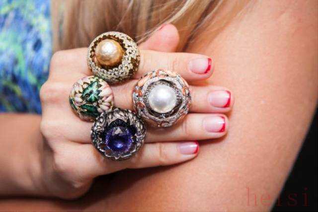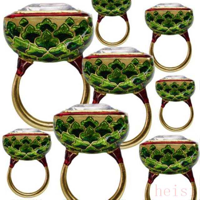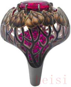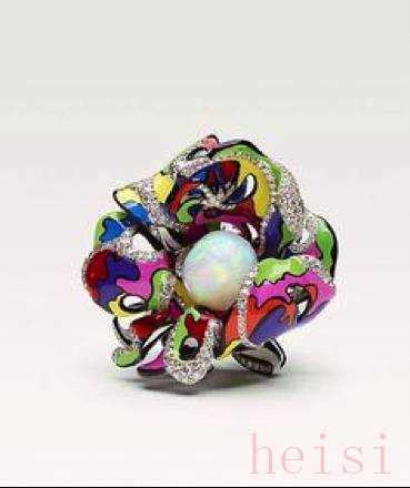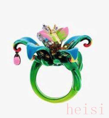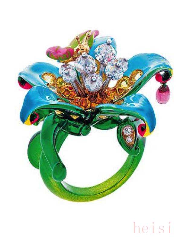 迪奥风格色彩明快艳丽,几乎所有的金属上都有颜色的存在,这些作品上,出现的珐琅并不是传统的高温明火珐琅,而是低温珐琅,这种材料的特点就是,温度低,工艺难度小,戒托上的颜色则是烤漆工艺。