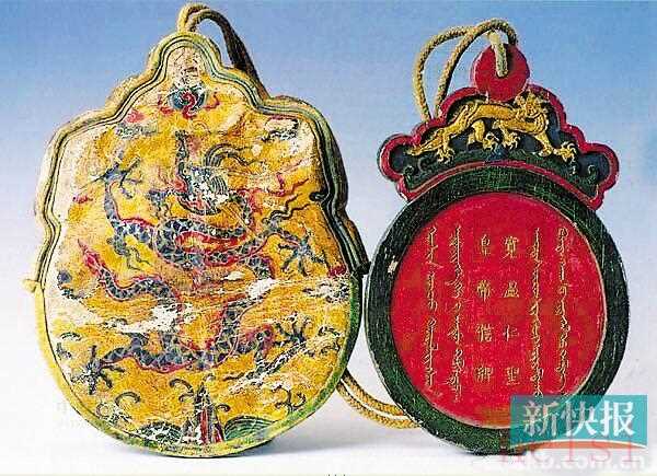 信牌木质,作出廓壁形。上部作朵云形,周边起棱,饰一回首行龙,下为圆形,绿色宽边,中部下凹,红底金字,以满汉蒙三种文字书写“宽温仁圣,皇帝信牌”八字,皮套黄地彩绘升龙戏珠纹。信牌为皇帝专用,是调动军队的凭证。