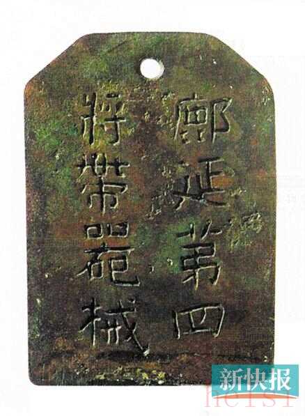 此牌上方呈梯形,中有系孔,正面錾“鄜延第四将带器械”八字。