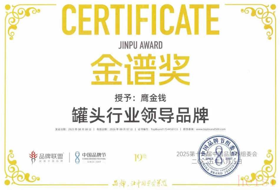 “2025中国品牌500强”榜单遵循“独立、客观、公正、科学”的行业标准,在国标基础上,通过人工智能大数据应用系统,对入选的企业进行全面的品牌价值测评,并完成品牌信用资产的确权。在激烈的竞争与层层筛选中,鹰金钱脱颖而出,彰显了罐头行业领导品牌的不凡地位。