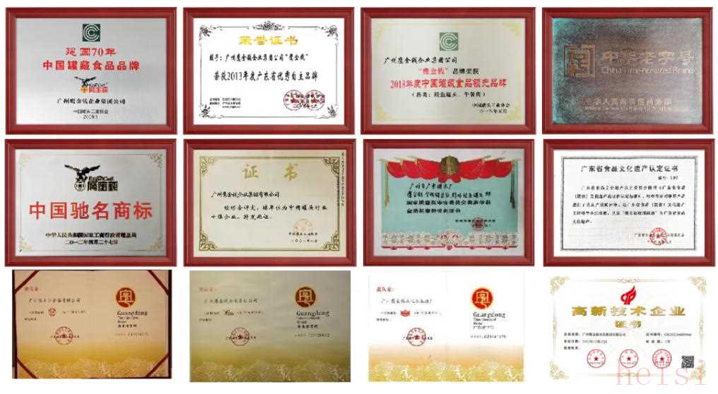 经过半个多世纪的精心耕耘与不懈努力,“鹰金钱”品牌已巍然屹立于中国罐头行业的巅峰之列,不仅铸就行业内的标杆地位,更成为中国罐头行业的骄傲与象征。于1989年、1991年连续两次获得国家优质产品金质奖,2017年荣获“中华老字号标杆企业”,2019年被授予“建国70年中国罐藏食品品牌”,2021年荣获“2021广东·老字号最具活力奖”,2022年荣获“十三五”罐头产业领域突出贡献先进单位,2023年鹰金钱公司被评为“胡润中国预制菜生产企业百强榜”,2024年“鹰金钱”获评为“广东知名品牌”。