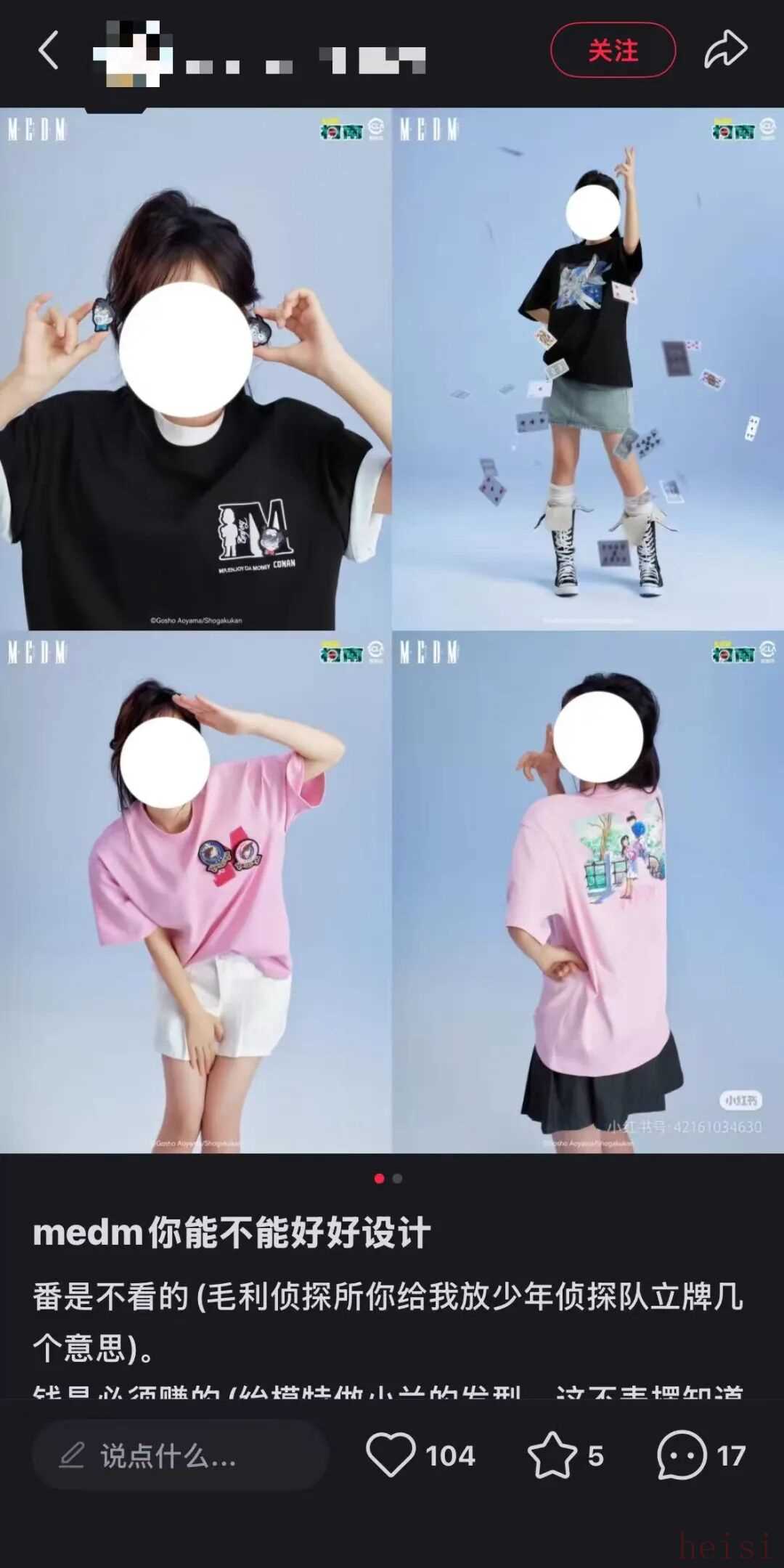 MEDM抖音账号首页MEDM近期公布的名侦探柯南联名款,因为低估了IP粉丝构成的复杂度以及需求的多样性,被集体吐槽敷衍不用心。服装上印制的图案过于直白,缺乏设计感,留给品牌的发挥空间并不充分,以及品牌主理人也在回应里隐晦提及设计受限,这或许与版权方审核有关。