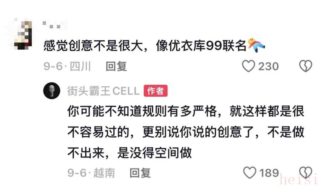 事实上这也不全是品牌方的责任,在版权方审核条件严格的情况下,想要放开手脚大胆设计的确很难。新联名系列被吐槽设计“像优衣库一样敷衍”之后,WHOOSIS的主理人CELL就忍不住在评论区大倒苦水,更富有创意的设计不是他们不想而是不可以。