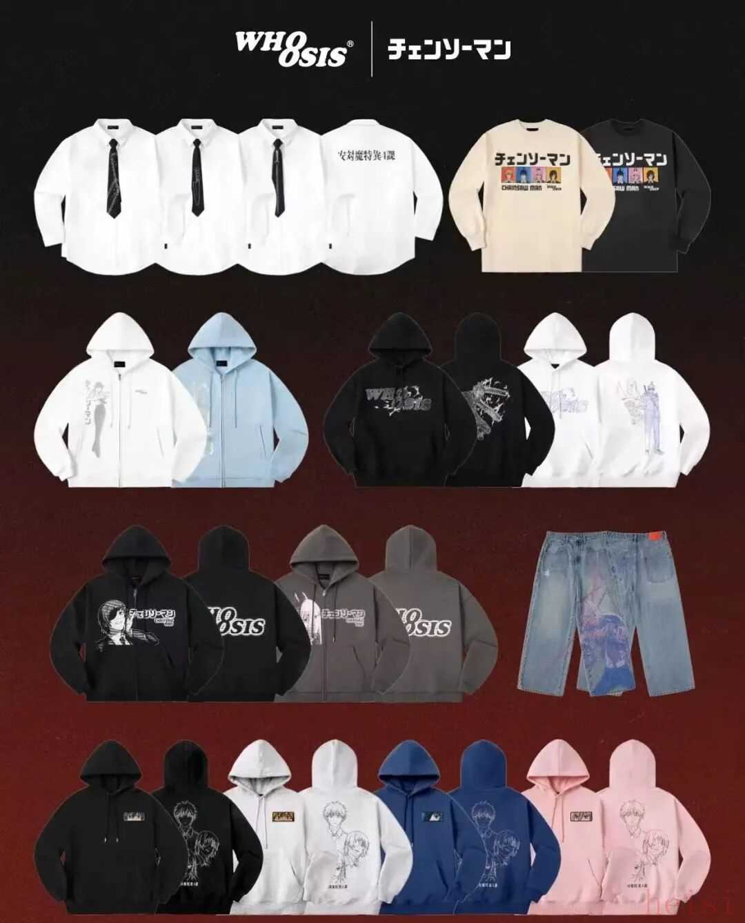 相同情况也在近期WHOOSIS与电锯人的联动中发生。这次联动在粉丝间关注度颇高,100元到300元的产品定价相对亲民,但发售成绩却不理想,核心问题在于设计“差点意思”。《电锯人》原作充斥着暴力美学和荒诞叙事,店内款式设计则普遍偏基础,难以凸显出原作气质。
