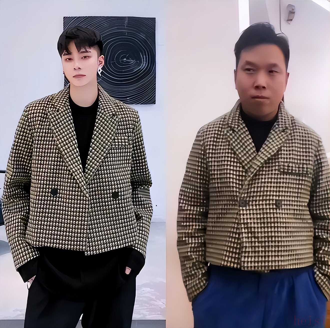 看模特的效果图,这妥妥的一个韩系潮流范帅哥啊,结果普通人穿上身之后,画风突变,直接变得又土又挫。