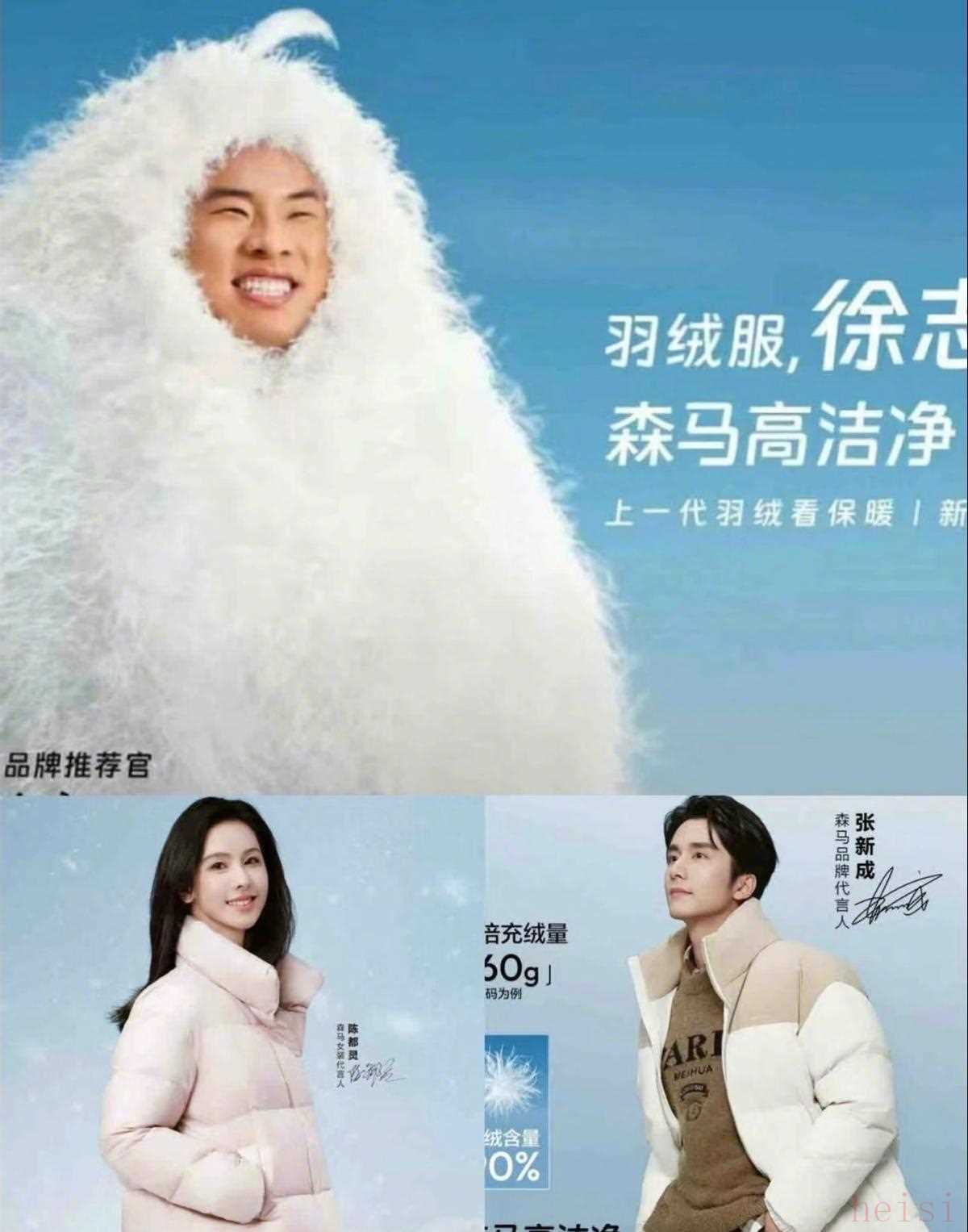 有网友逛街的时候看到森马的代言人海报,一身黑皮的徐志胜穿着张新成同款羽绒服,正对着镜头微笑,但是这笑容怎么看都有点搞笑意味。