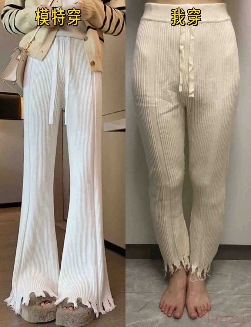 结果买家拿到手后,别说货不对板了,就连这颜色都对不上啊。模特穿的不是阔腿裤嘛,怎么到买家这里就变紧身裤了?
