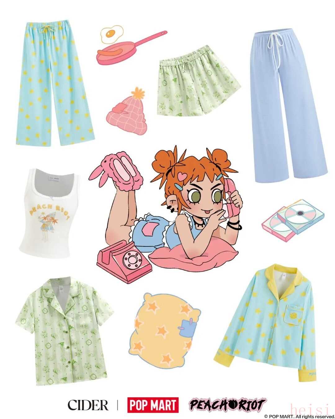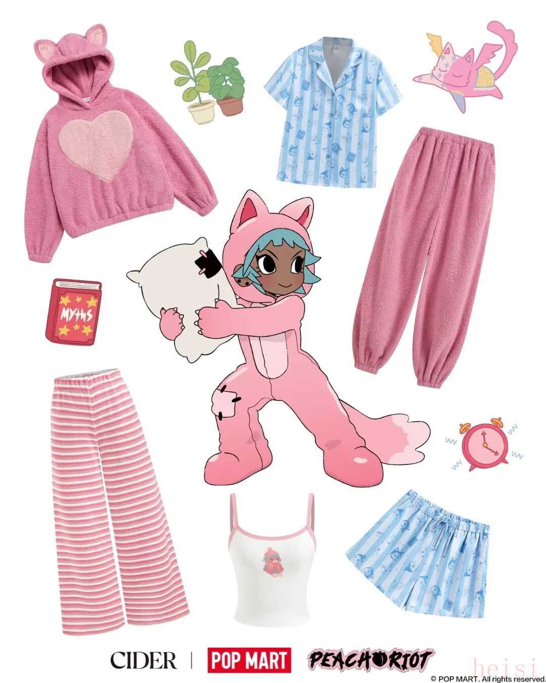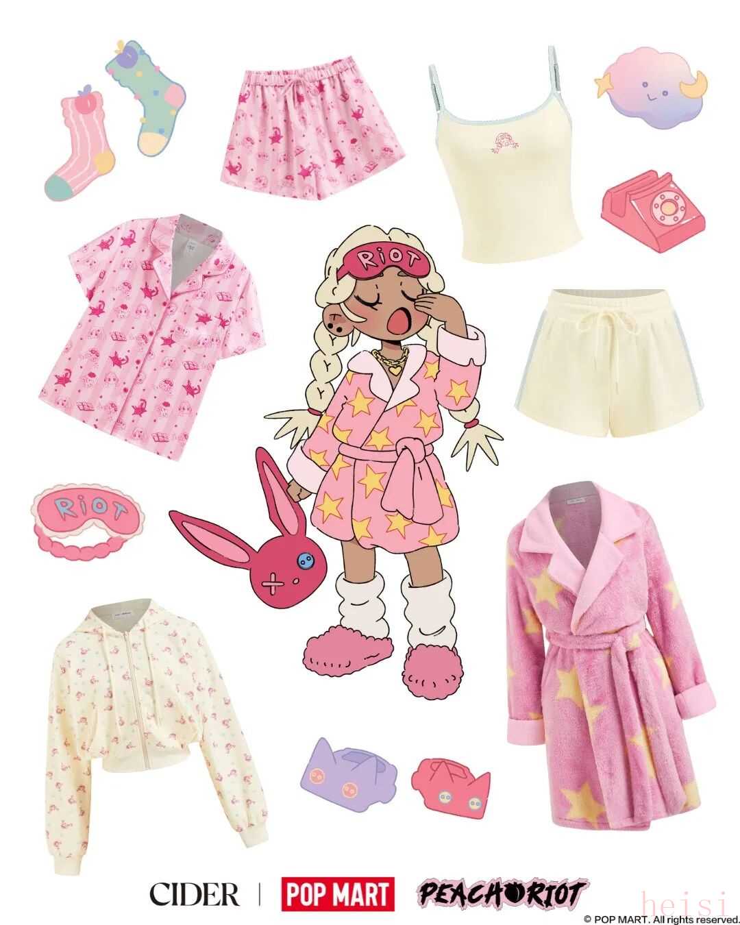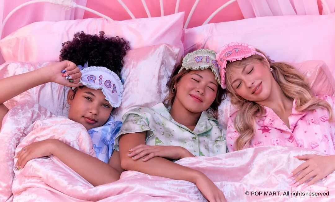 两个品牌联手打造的“睡衣派对”联名系列,更像是一场早有默契的双向奔赴。作为泡泡玛特在北美首次涉足时尚领域的尝试,Peach Riot与CIDER的合作绝非偶然。