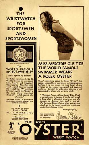 一年之后,蚝式腕表正式走进公众视线。1927年,成功横渡英吉利海峡的第一位英国女性 —— 泳手梅塞迪丝・吉莉丝Mercedes Gleitze,10月再次对英吉利海峡发起挑战。游了10个多小时上岸之后,记者发现挂在她脖子上的劳力士蚝式腕表,即使在长时间仅十几摄氏度的极冷海水浸泡下,腕表的正常运行并没有受到影响,证实了腕表可靠的防水性能。以此为契机,劳力士在《每日邮报》Daily Mail的头版发表了一整版的文章宣告了防水腕表的成功,标题写到:“劳力士蚝式腕表的正式面世,标志着全球钟表业的胜利跃进”。泳手梅塞迪丝・吉莉丝也因此成为了劳力士的首位代言人。