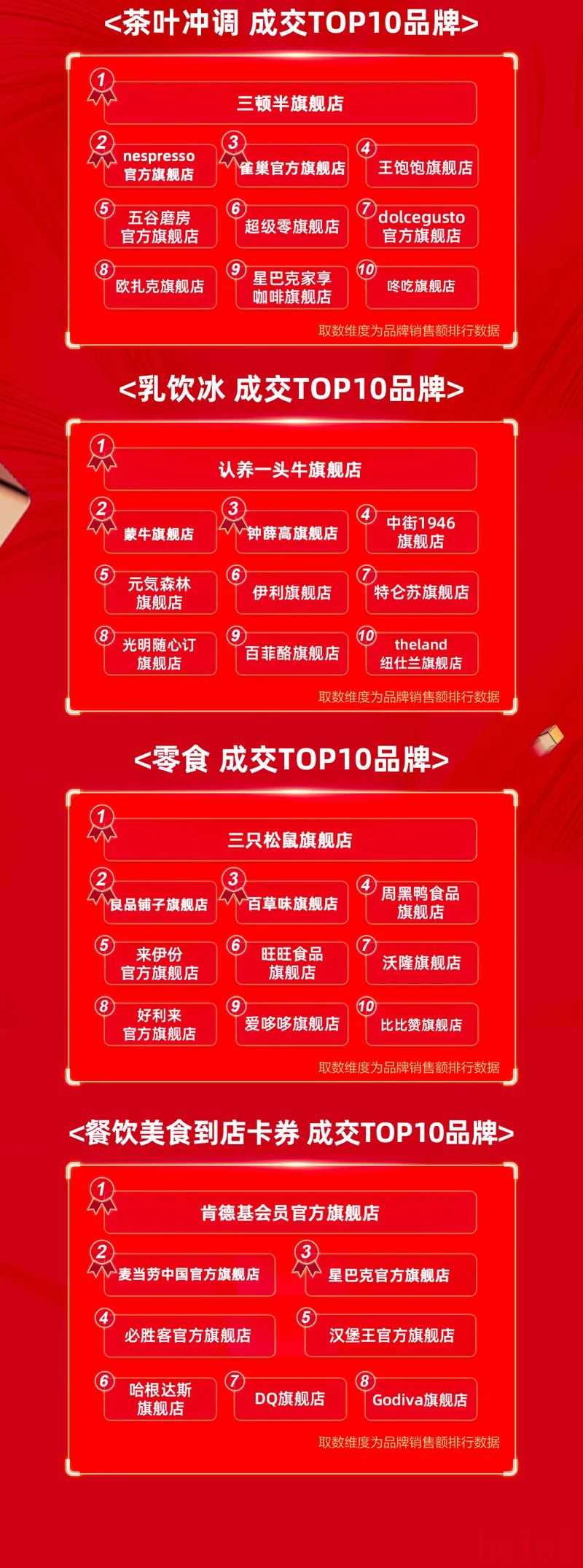"食品饮料类目:" 三只松鼠以超过150亿元人民币的销售额领跑食品饮料类目,良品铺子、百草味等品牌也位居前列。