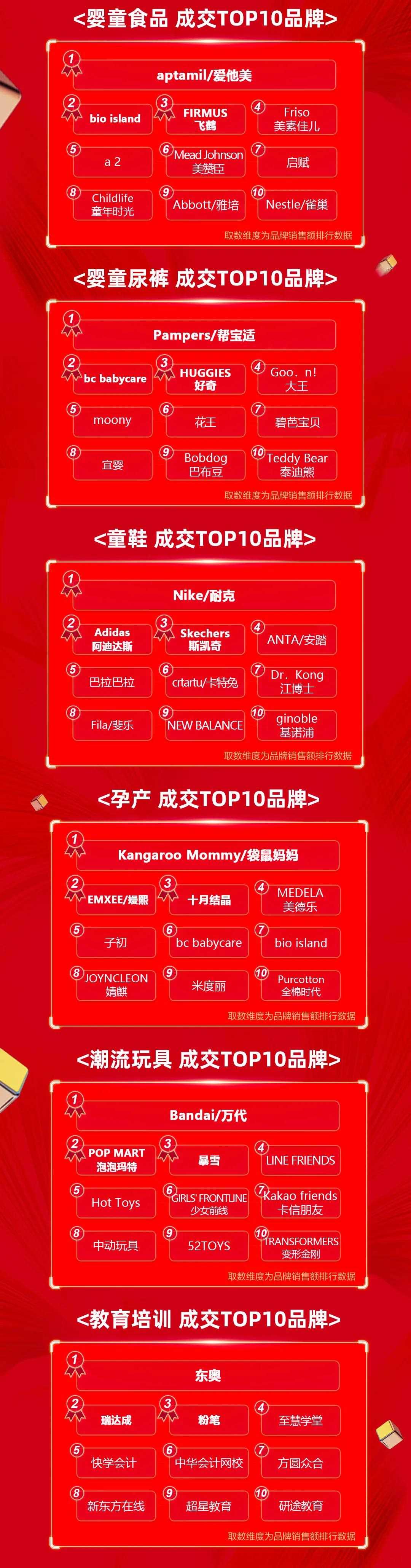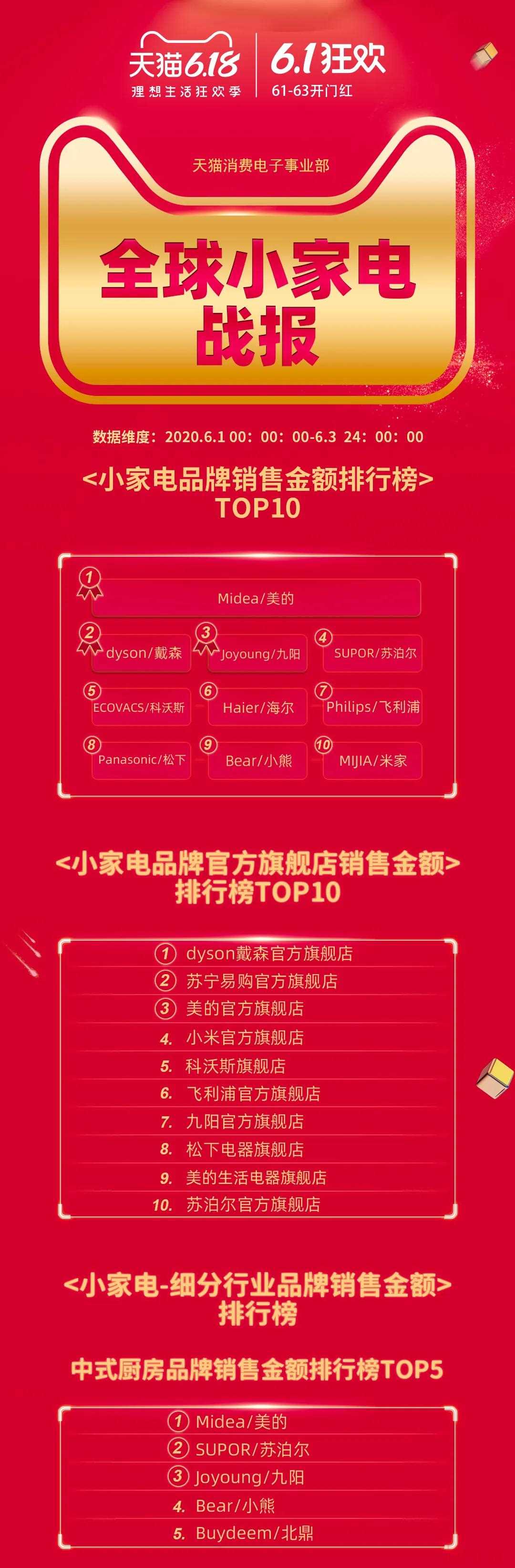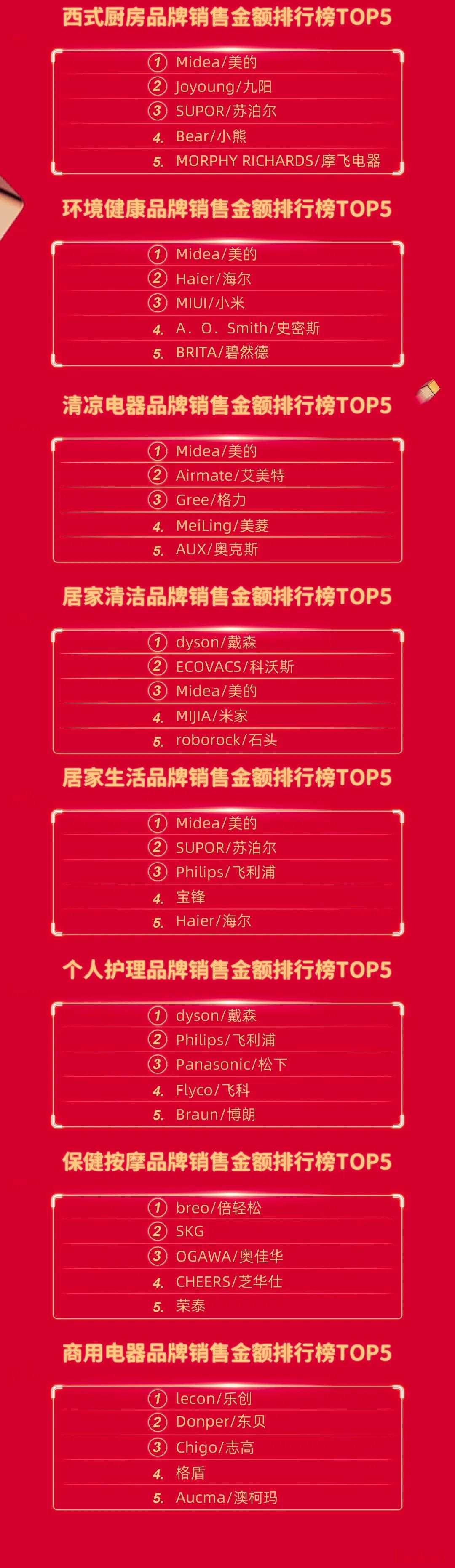 "家电类目:" 海尔智家以超过1000亿元人民币的销售额领跑家电类目,美的、格力等品牌也表现出色。