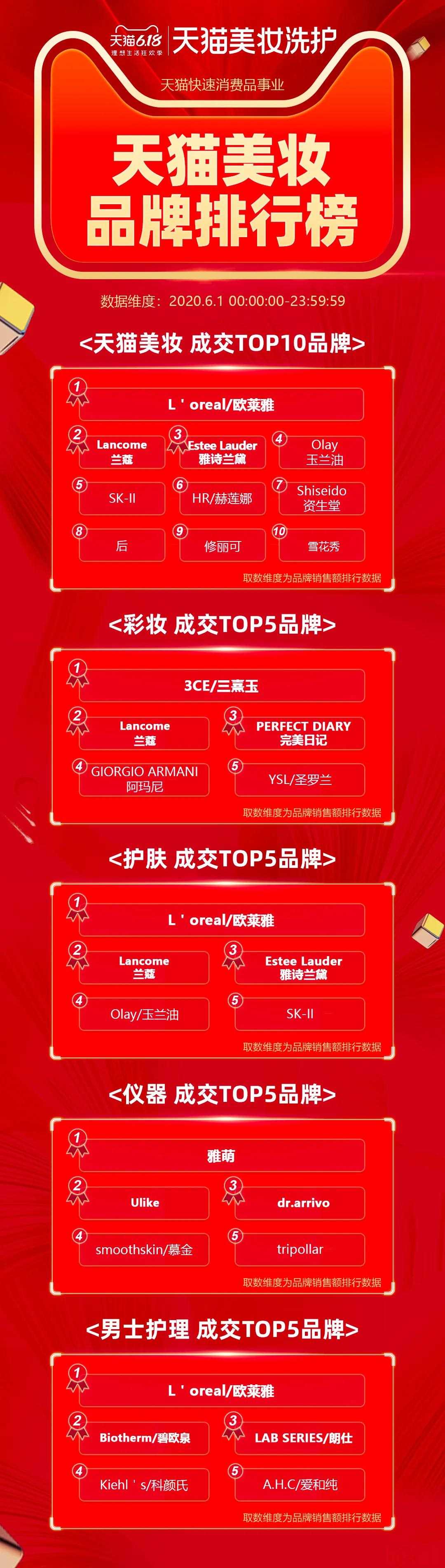 "美妆类目:" 雅诗兰黛集团以超过400亿元人民币的销售额领跑美妆类目,欧莱雅、兰蔻等品牌也位居前列。