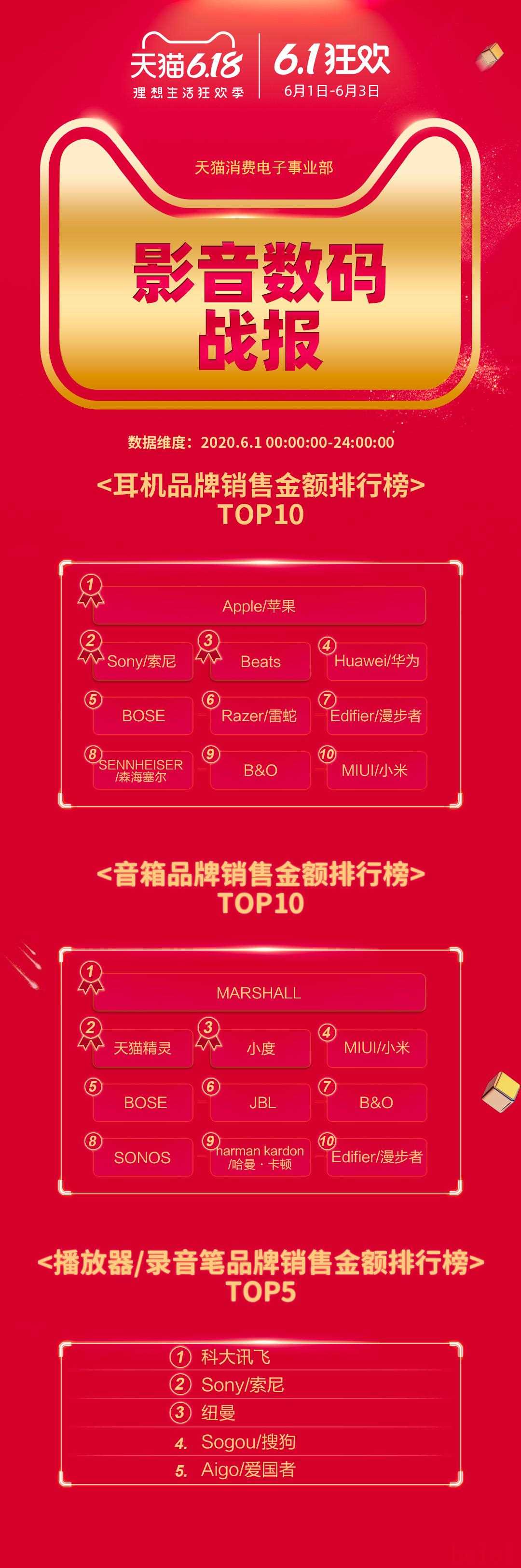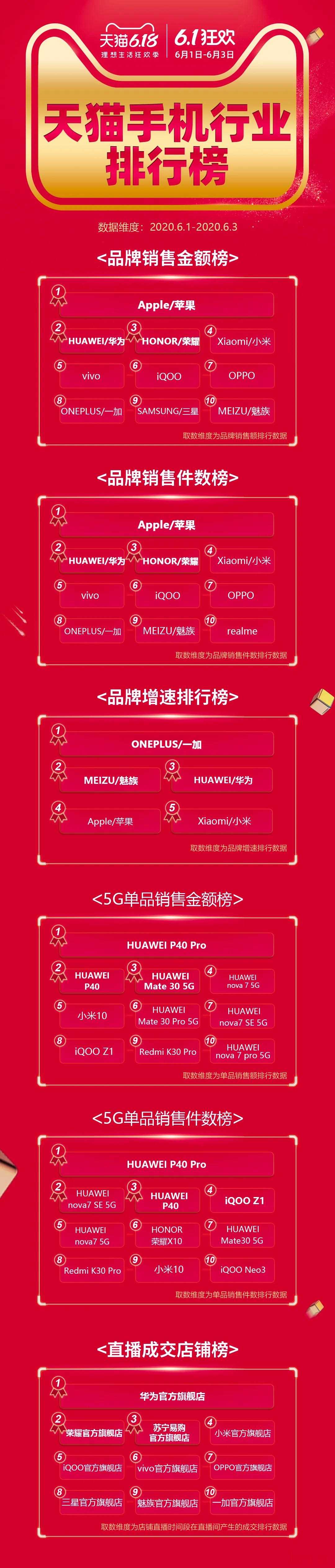 2020年天猫618开局销售火爆。6月1日,开售10小时整体成交额同比猛增50%,当天有32个品牌破亿。苹果官方首次参加天猫618活动,仅用5小时iPhone就卖出超5亿。华为阵营则在5G手机销售中全面爆发。