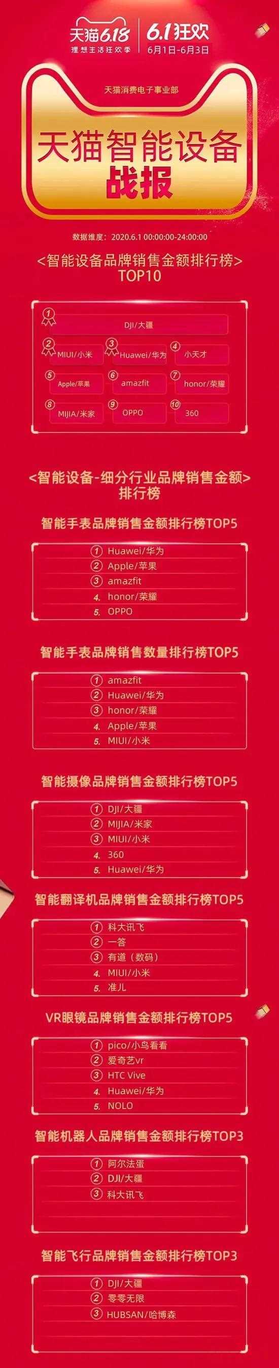 "手机类目:" 小米集团以超过1100亿元人民币的销售额领跑手机类目,成为天猫618手机类目销售冠军。华为、苹果紧随其后。