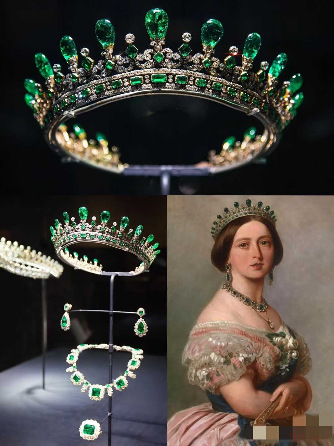 "描述:" 作为“宝石之女”,维多利亚女王拥有大量珠宝,其中不乏以祖母绿为焦点的作品。虽然她最著名的可能是“黑色恶毒之心”祖母绿(现已失踪),但她曾佩戴