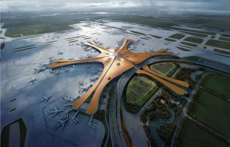 由Zaha Hadid 建筑事务所与法国 ADP Ingénierie 联合设计,计画自2014 年展开,并于 2019 年正式启用。建筑外观採放射状结构,从空中俯瞰像是海星星芒、降落地面的六角星,又或者如凤凰展翅般意象,但无论哪一种,都彰显其作为全球最大单一机场航厦之一的气势。